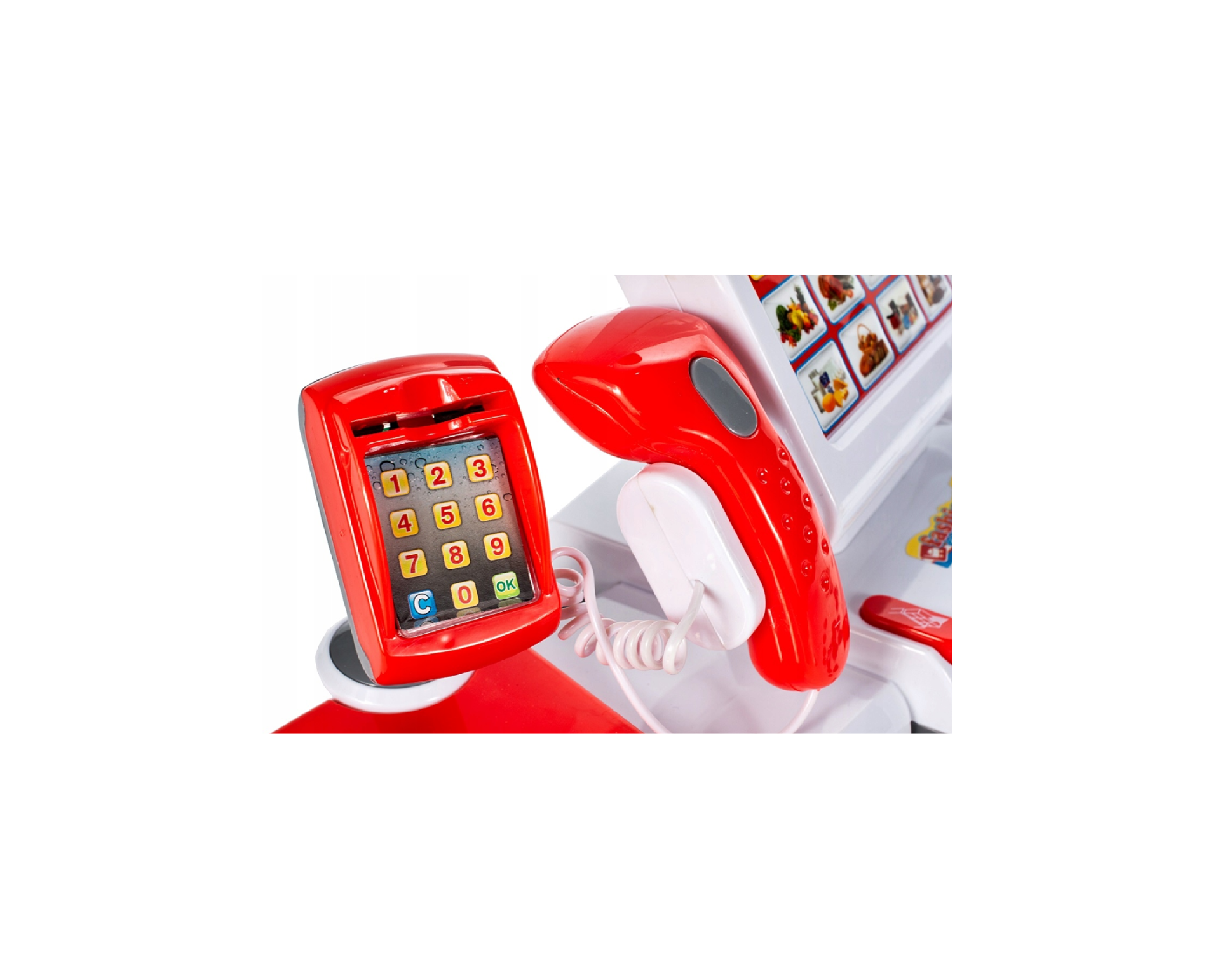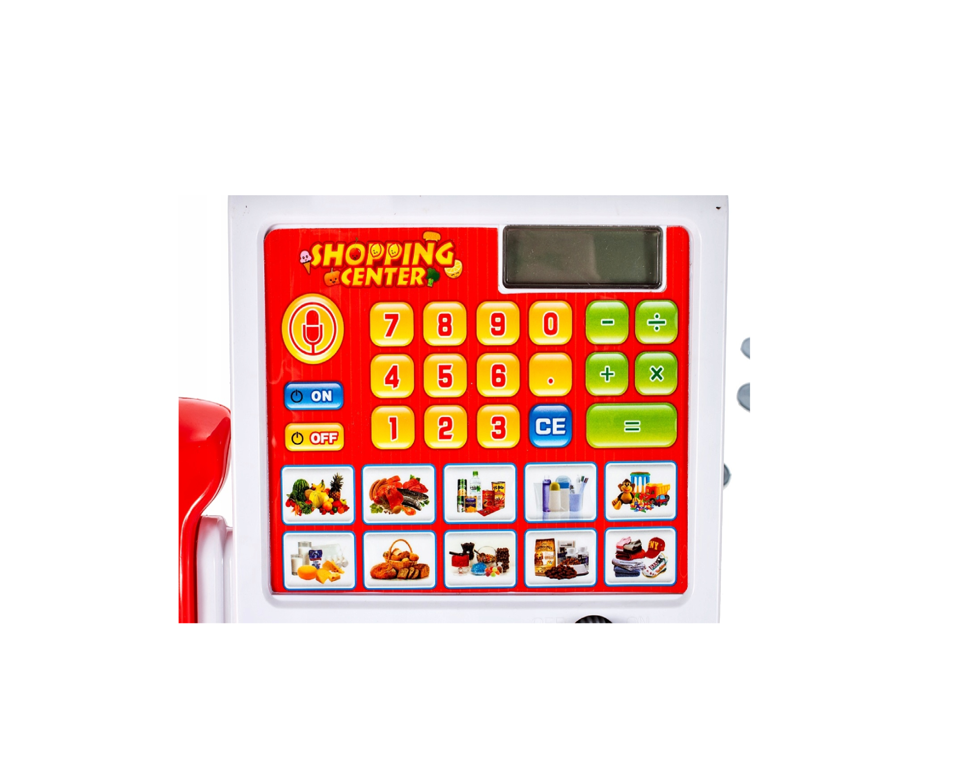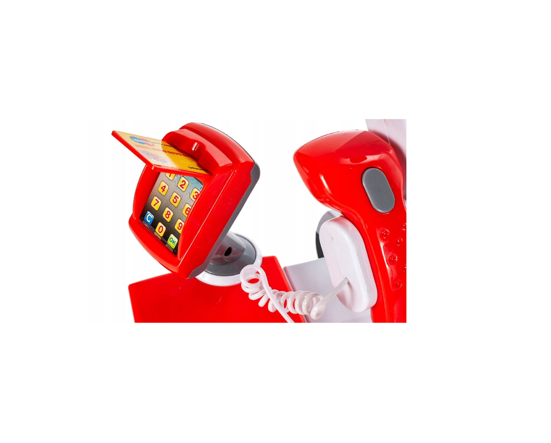 Exista un buton rosu mare pe panoul frontal al casei de marcat, care poate fi folosit pentru a deschide sertarul de numerar. Setul include si bancnote, un card bancar, monede, o sticla de apa, lapte, suc si ulei pentru o distractie si mai interesanta. Casa de marcat electronica cu scaner este o jucarie perfecta pentru fiecare fata care iubeste sa se joace in magazin.