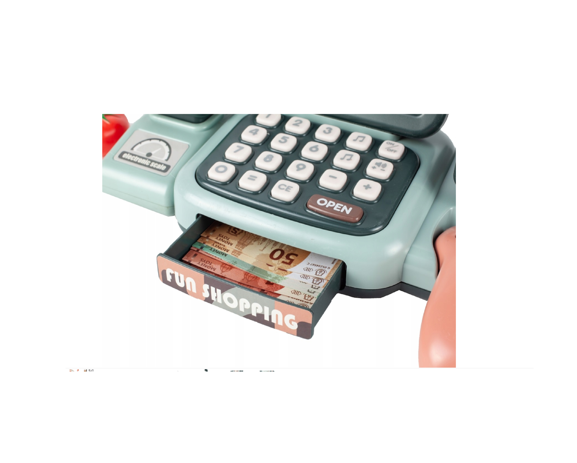 Casa de marcat are un afisaj LCD, un microfon, un scanner, un cantar pentru produse si chiar un cititor de carduri de plata de jucarie .