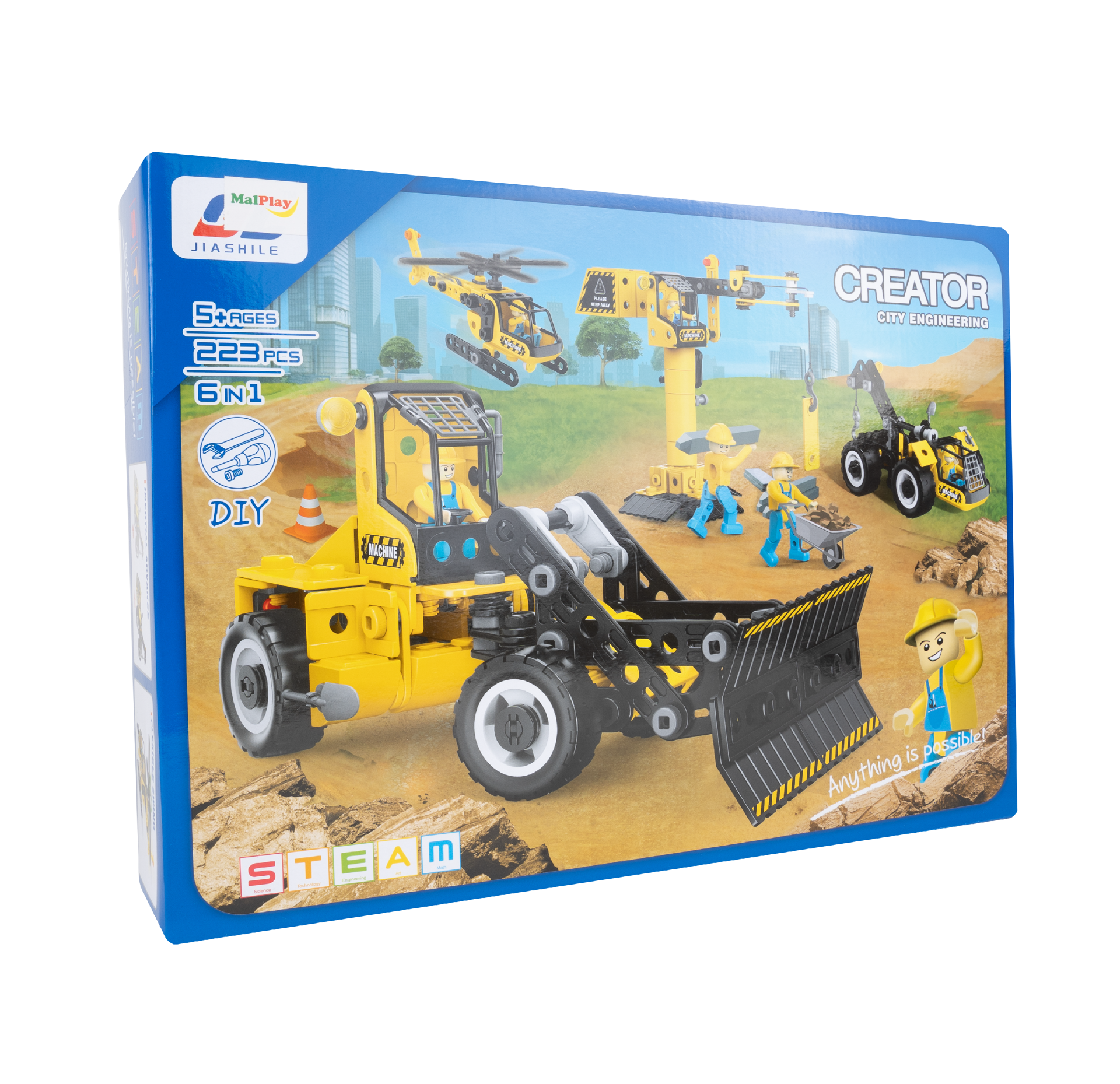 Setul include toate elementele necesare pentru asamblarea de la zero a unuia dintre cele 6 vehicule si utilaje. In acelasi timp, puteti crea un singur model: excavator, buldozer, macara, elicopter, remorcher sau drona.
