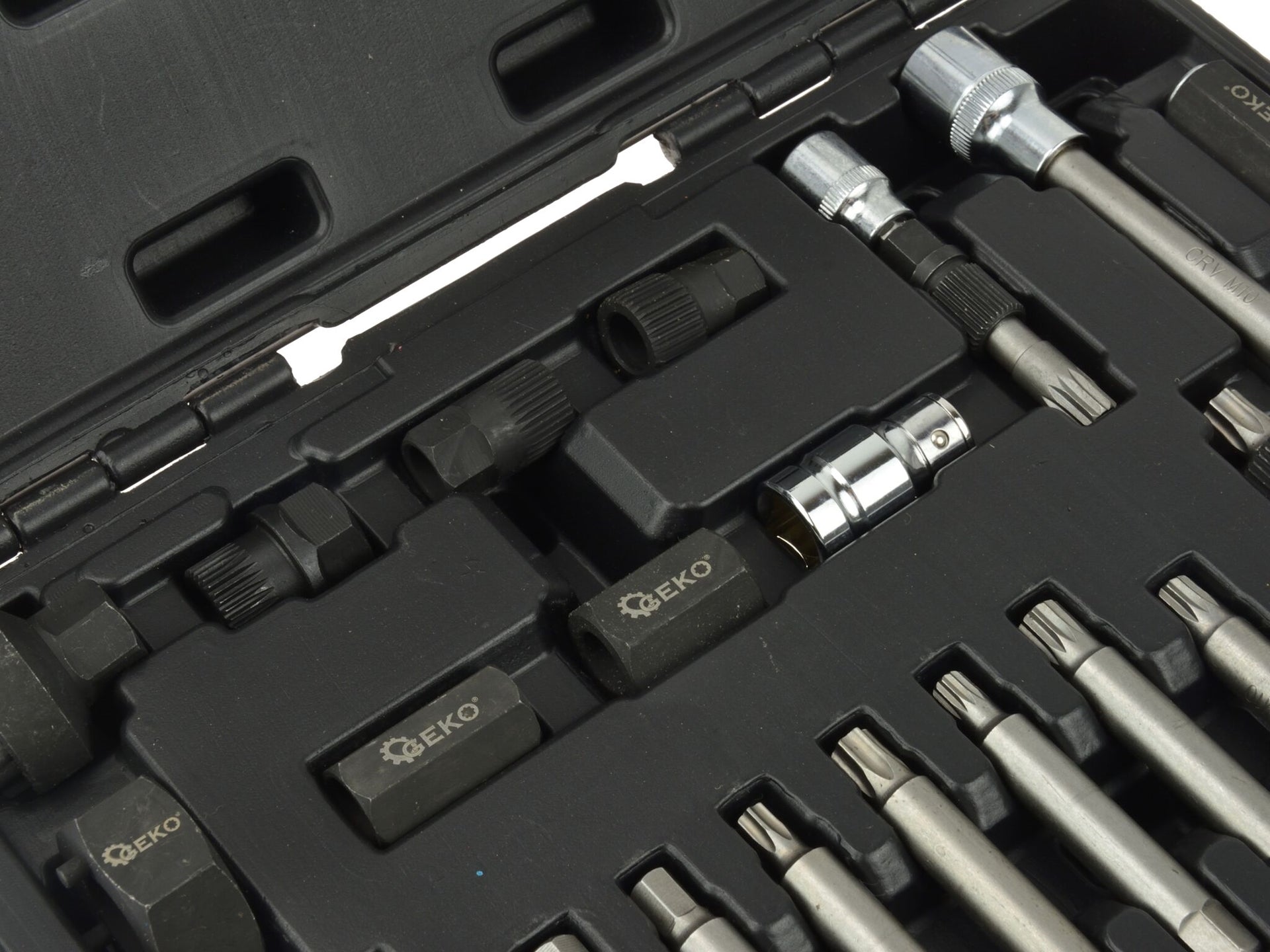 Set de chei pentru montarea și demontarea alternatoarelor. Cheile sunt fabricate din oțel crV-vanadiu de înaltă calitate CrV, ceea ce le face durabile și rezistente la daune. Cheile permit deșurubarea simultană a șurubului de montare a fuliei (folosind bițele corespunzătoare) și menținerea fuliei cu ambreiajul (cu ajutorul unei prize specializate). Setul este perfect pentru ateliere profesionale și servicii auto.