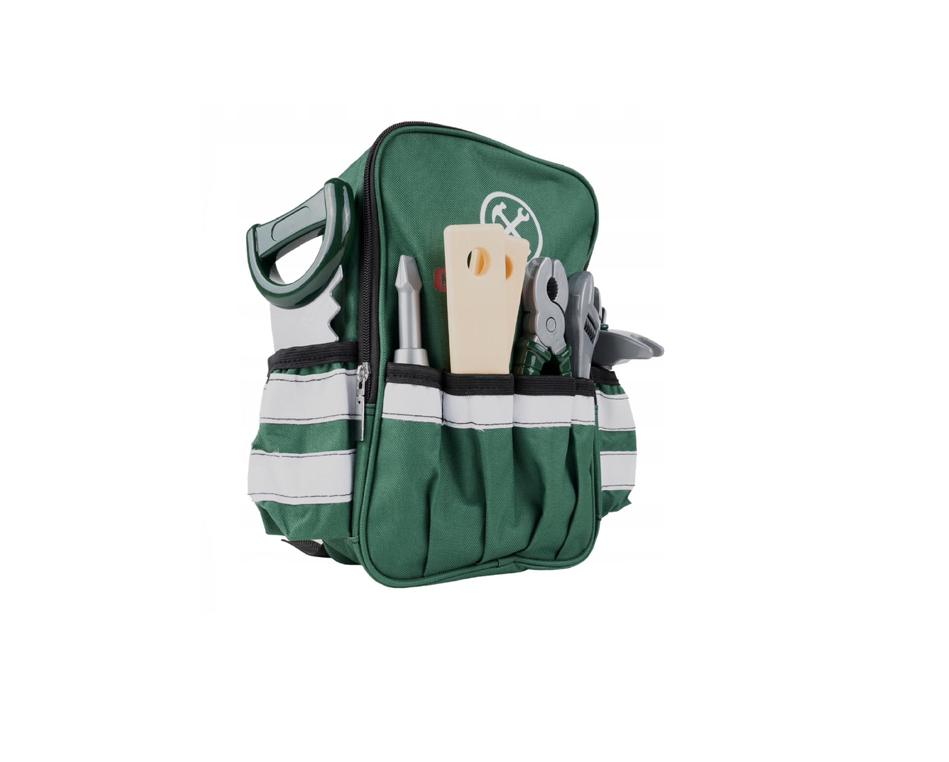 Rucsac de bricolaj cu unelte si un burghiu cu baterie. Copiii isi imita adesea parintii - si ce baiat nu si-ar dori sa fie ca tata? Pentru a va proteja copilul de echipamente grele reale - va prezentam jucarii pentru baieti care imita unelte reale!