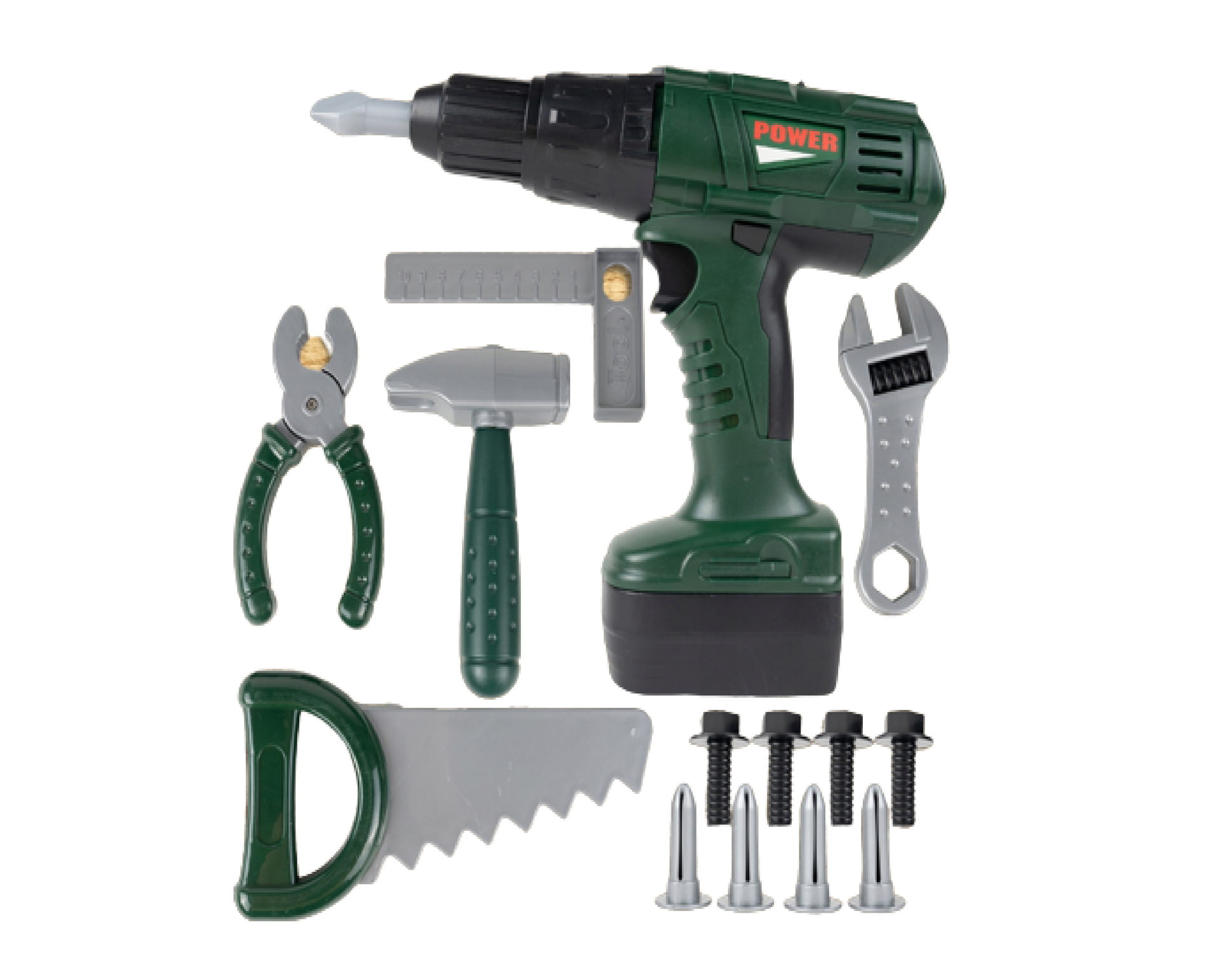 Masina de gaurit este alimentata de doua baterii AA. Cand este apasat, burghiul se roteste inainte sau inapoi, in functie de directia selectata. Un comutator special modifica rotatia de la stanga la dreapta, iar accesoriile incluse in set vor face distractia mai incitanta!