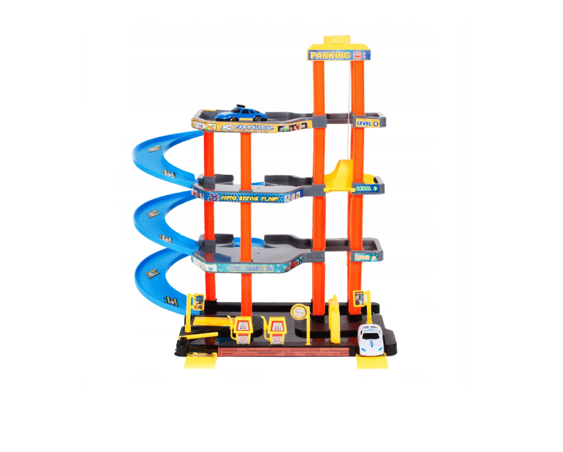 O parcare cu mai multe etaje in centrul unui oras mare este o distractie grozava pentru fiecare baiat. Coborarile abrupte, un lift mobil, indicatoarele informative sau o benzinarie sunt o completare perfecta a setului.