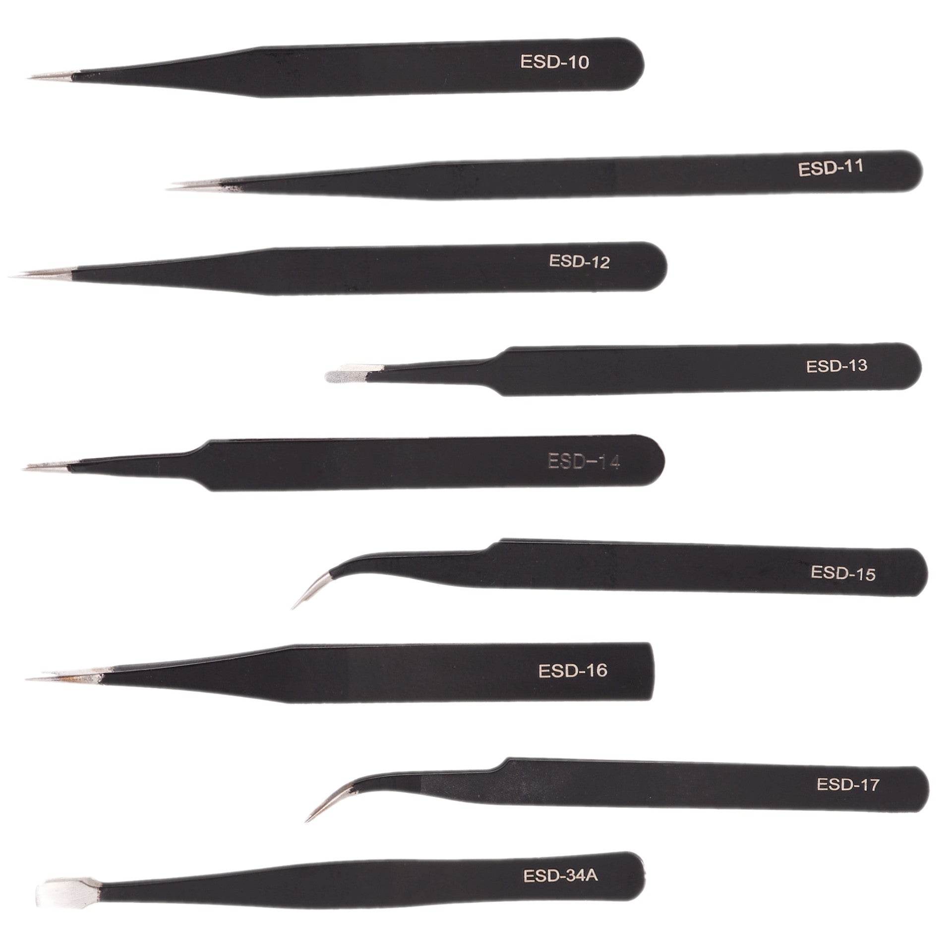 Set Complet de 9 Pensete: Acest set include 9 pensete metalice de precizie cu forme si dimensiuni variate, care sunt proiectate pentru a va ajuta sa manipulati si sa lucrati cu piese mici si detalii fine.