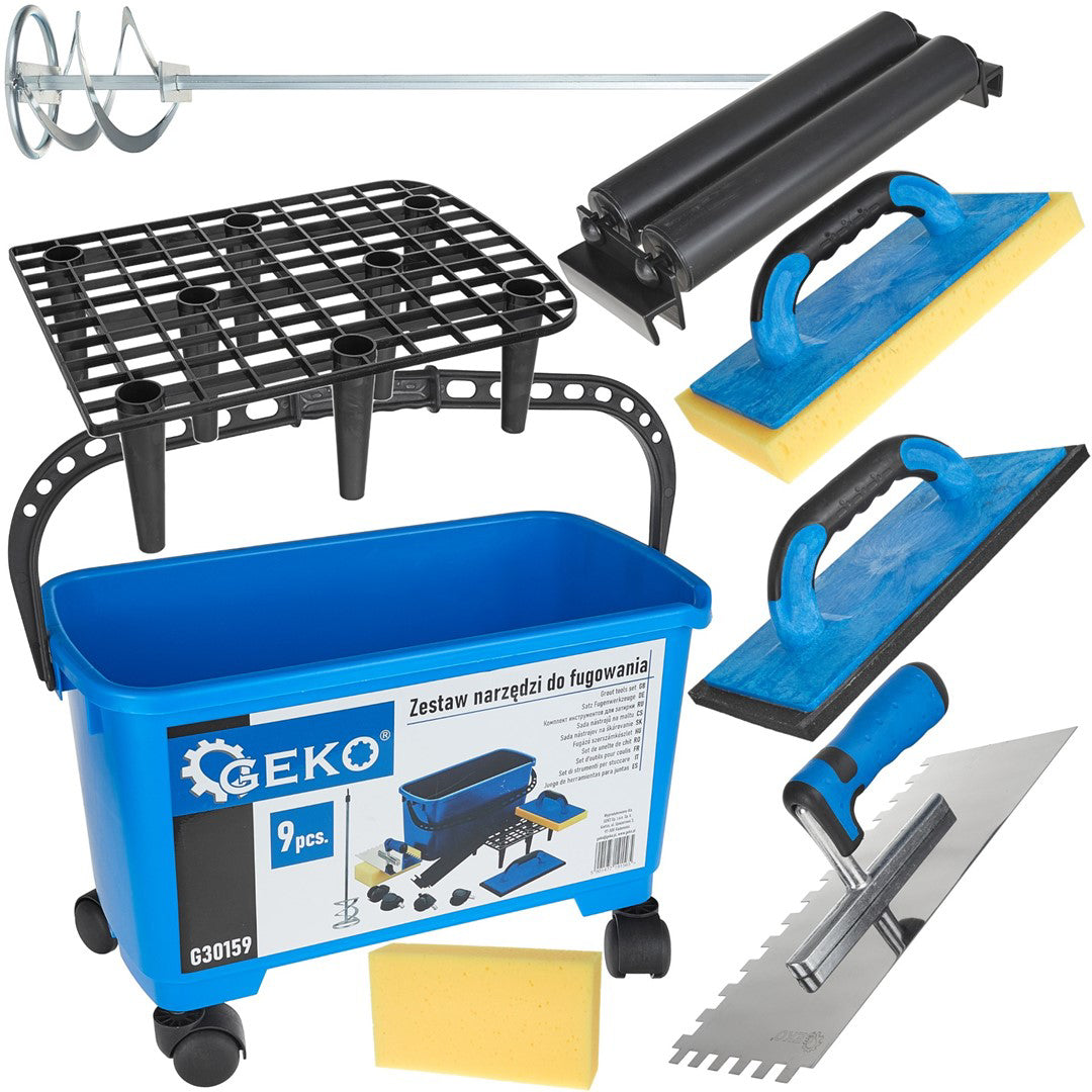 - Acest set a fost conceput pentru eficienta maxima si confort de utilizare. Datorita sculelor de inalta calitate, munca de chituire devine rapida, precisa si placuta. O galeata cu grila si role asigura usurinta in utilizare, eliminand problema excesului de apa, ceea ce se traduce printr-un finisaj mai precis si mai estetic al suprafetei. Mistriile si buretii adaptati diferitelor etape ale lucrarilor de placare cu gresie permit executarea completa a intregului proces - de la aplicarea chitului, la curatare, pana la finisarea finala.