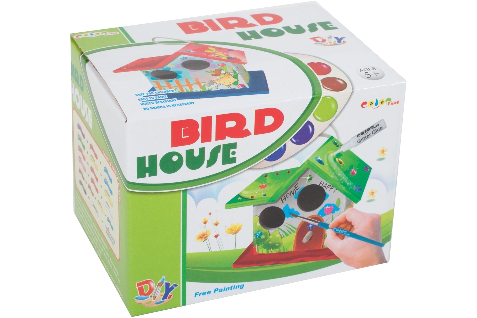 Pachetul contine casuta pentru pasarele si setul pentru pictura.