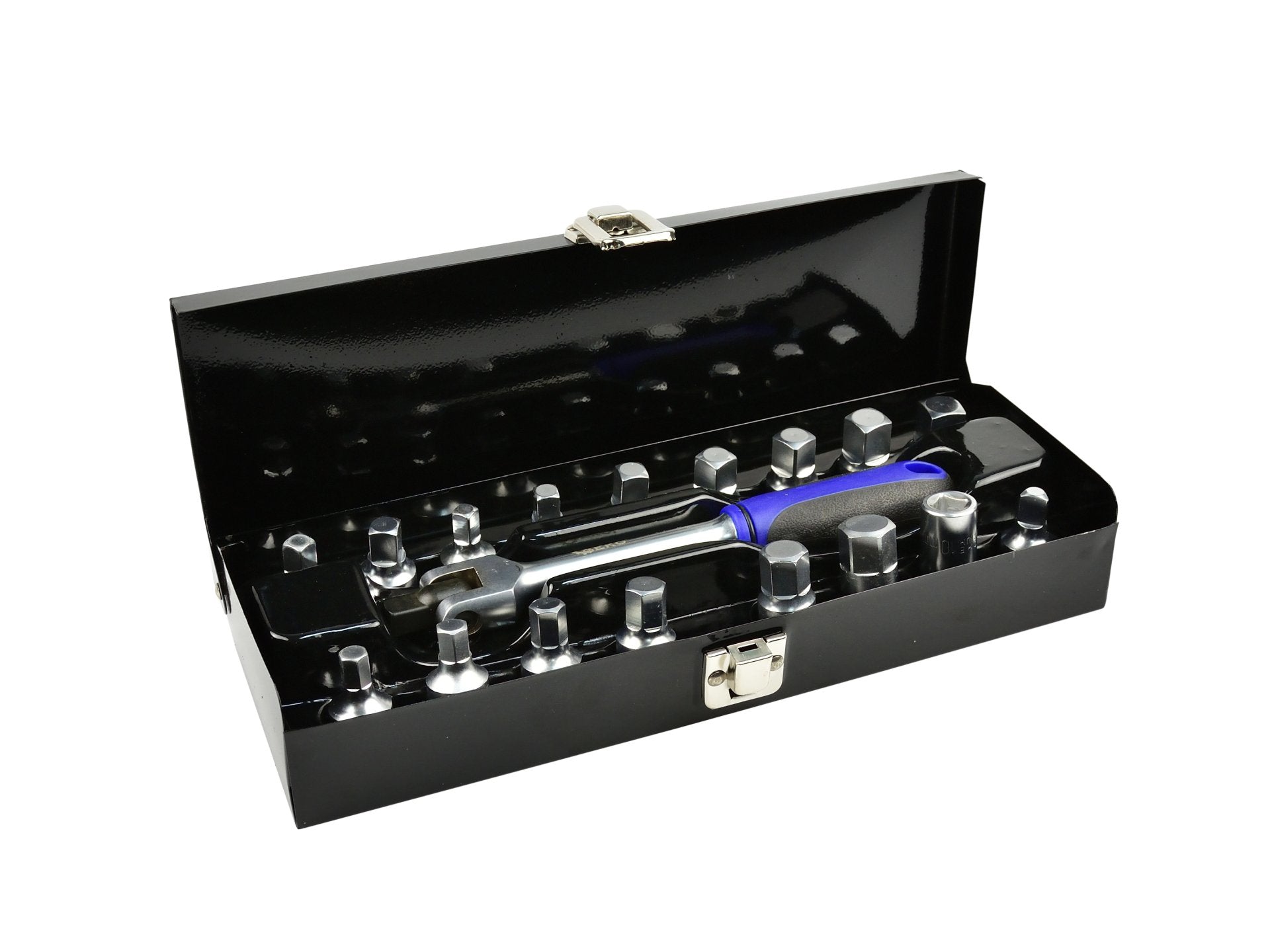 Un set de tubulare specializate pentru desurubarea dopurilor de scurgere din recipientele de ulei. Setul include 17 prize cu priza de 3/8" si un buton cu imbinare de 3/8". Toate elementele setului sunt realizate din otel de scule CrV durabil.