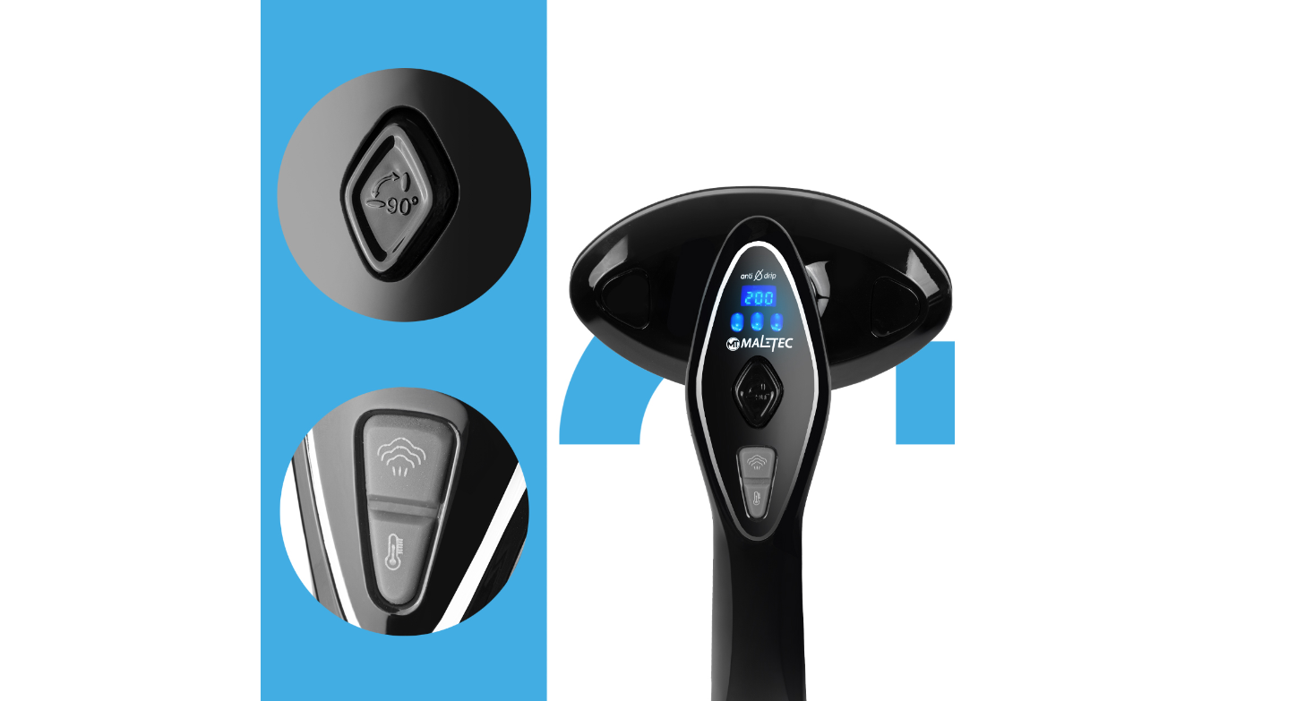 Aparatul cu abur are doua butoane functionale pe maner. Ele sunt responsabile pentru reglarea temperaturii si a iesirii de abur.