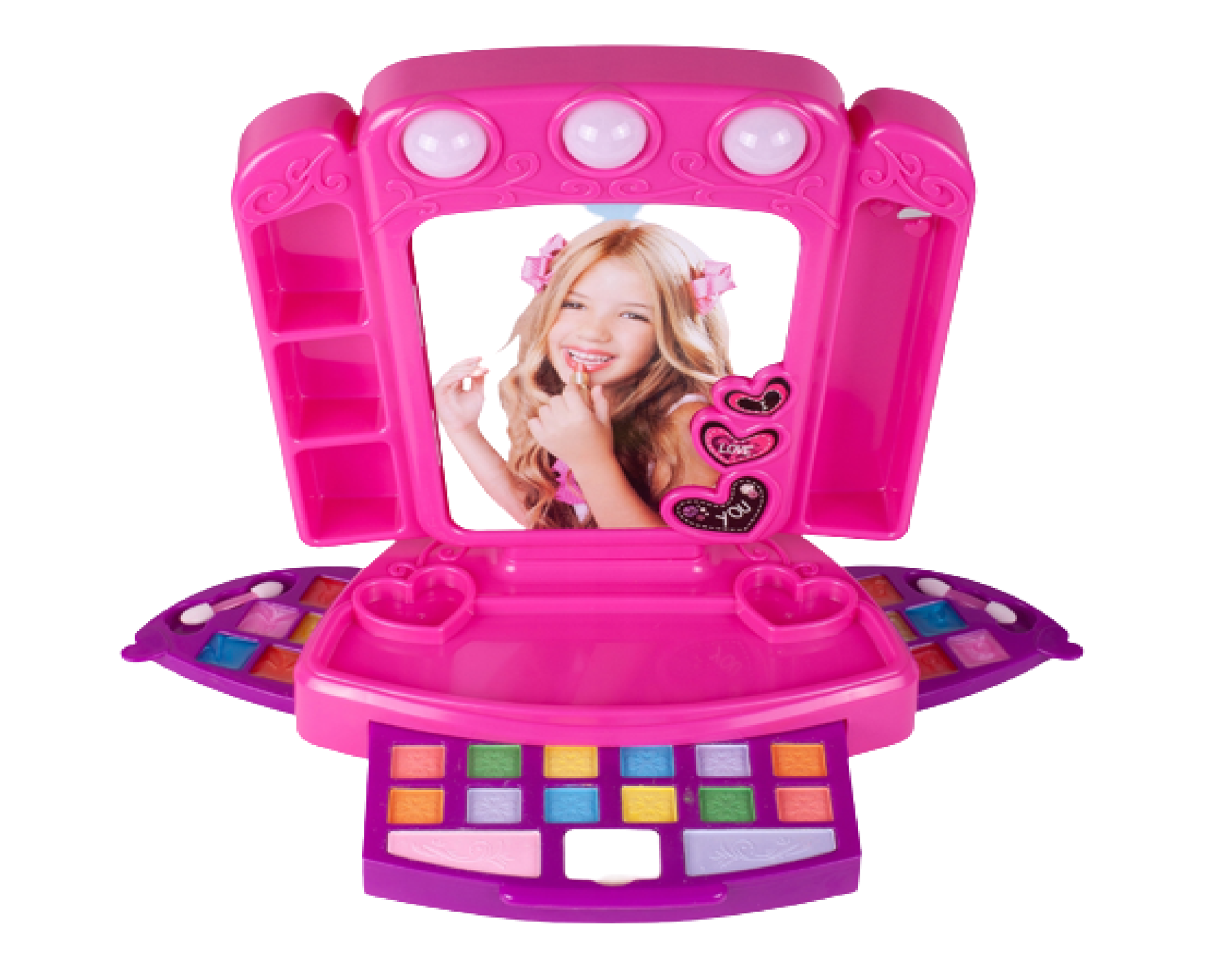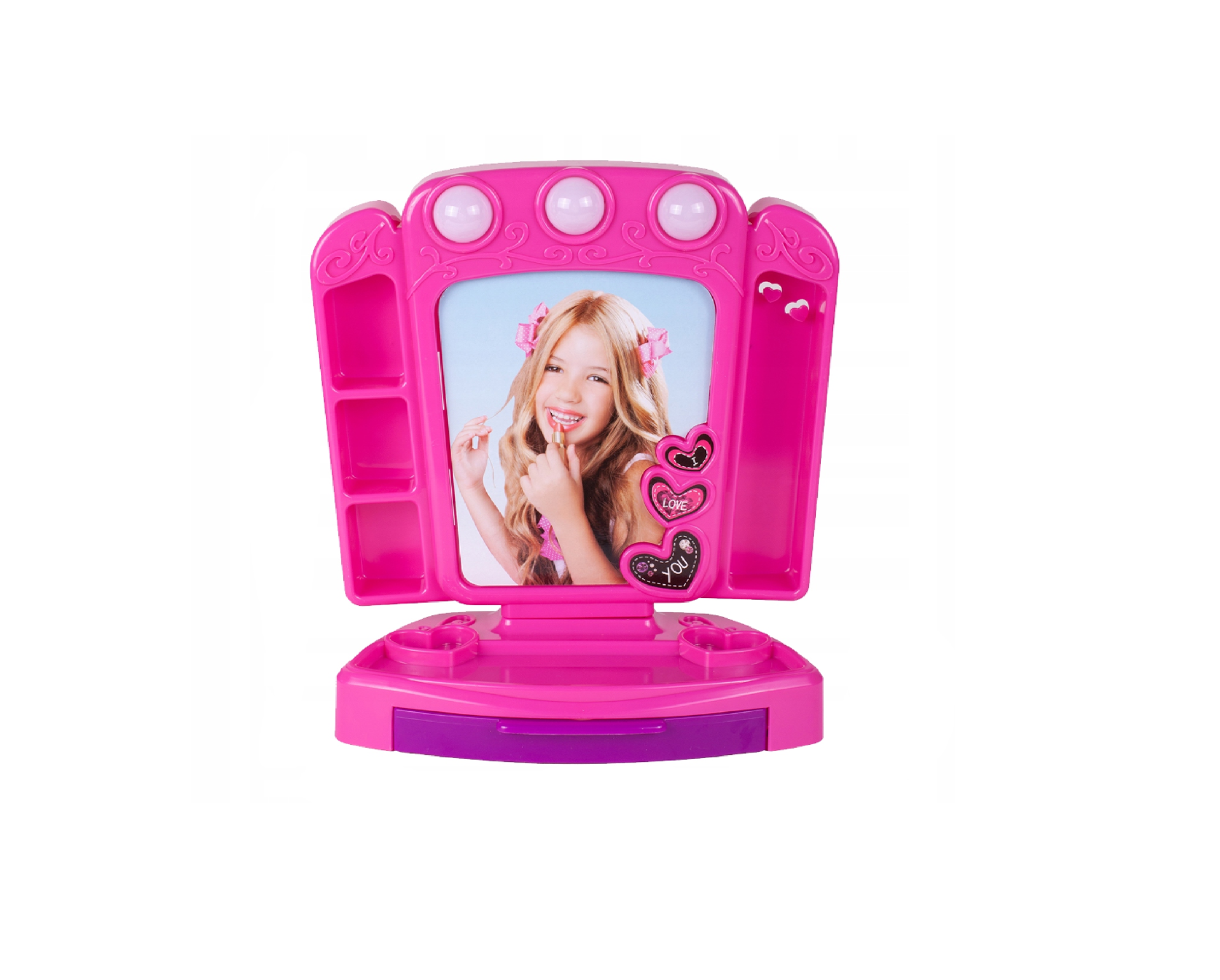 O oglinda stralucitoare iluminata cu lumini LED cu multe sertare pentru accesorii te va duce intr-o lume magica. Un set de produse cosmetice pentru a deveni un adevarat make-up artist si a crea un look glamour.Un set pentru fete la moda la timp, datorita caruia isi pot face singure primul machiaj.