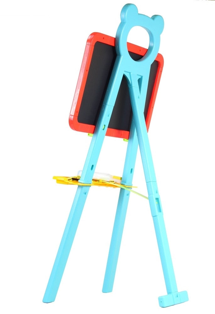 Perfect pentru a juca de-a profesorul mic. Jucaria a fost conceputa în asa fel încat sa atraga fiecare copil pentru ore de distractie deosebita. Tabla are doua fete: una pentru scrierea cu creta, cealalta - cu pixuri speciale, sterse cu o carpa uscata (pixul nu este inclus). Cleme speciale în partea de sus permit agatarea cartilor. Tabla este echipata cu: un raft pentru desenarea accesoriilor, creta si litere colorate cu magneti, foarte util pentru învatarea scrisului si citirii.