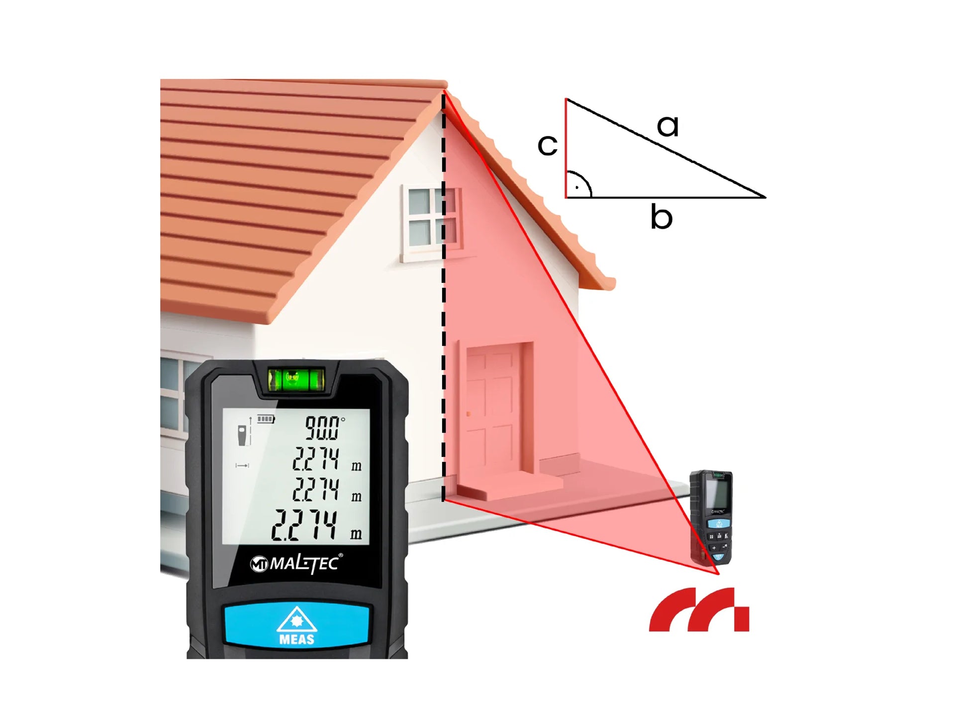 Una dintre cele mai avansate caracteristici ale telemetrului laser MasterMeter este functia Pythagoras. Datorita acesteia, este posibil sa se efectueze masuratori indirecte , cum ar fi inaltimea unei cladiri sau distanta pana la un punct care nu este direct accesibil. Functia Pythagoras, disponibila in versiuni cu 2 si 3 puncte, permite calcule precise ale dimensiunilor, eliminand nevoia de scari sau alte unelte.