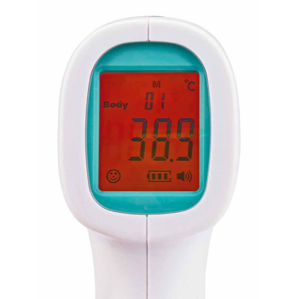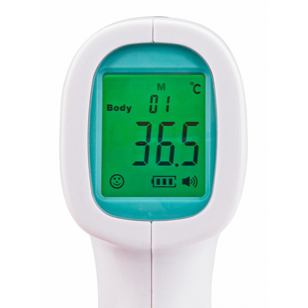 Termometru electronic cu infrarosu fara contact, cu 3 culori de iluminare din spate si memorie încorporata.
