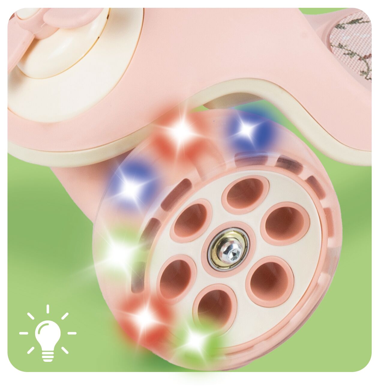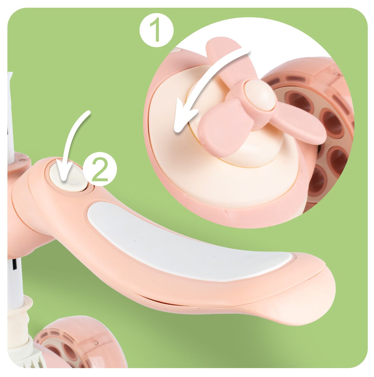 Trotineta are un ventilator interactiv in fata, pe care copiii il pot roti rotindu-l cu mainile. Ventilatorul este fixat in siguranta, permitandu-le celor mici sa se joace liber.