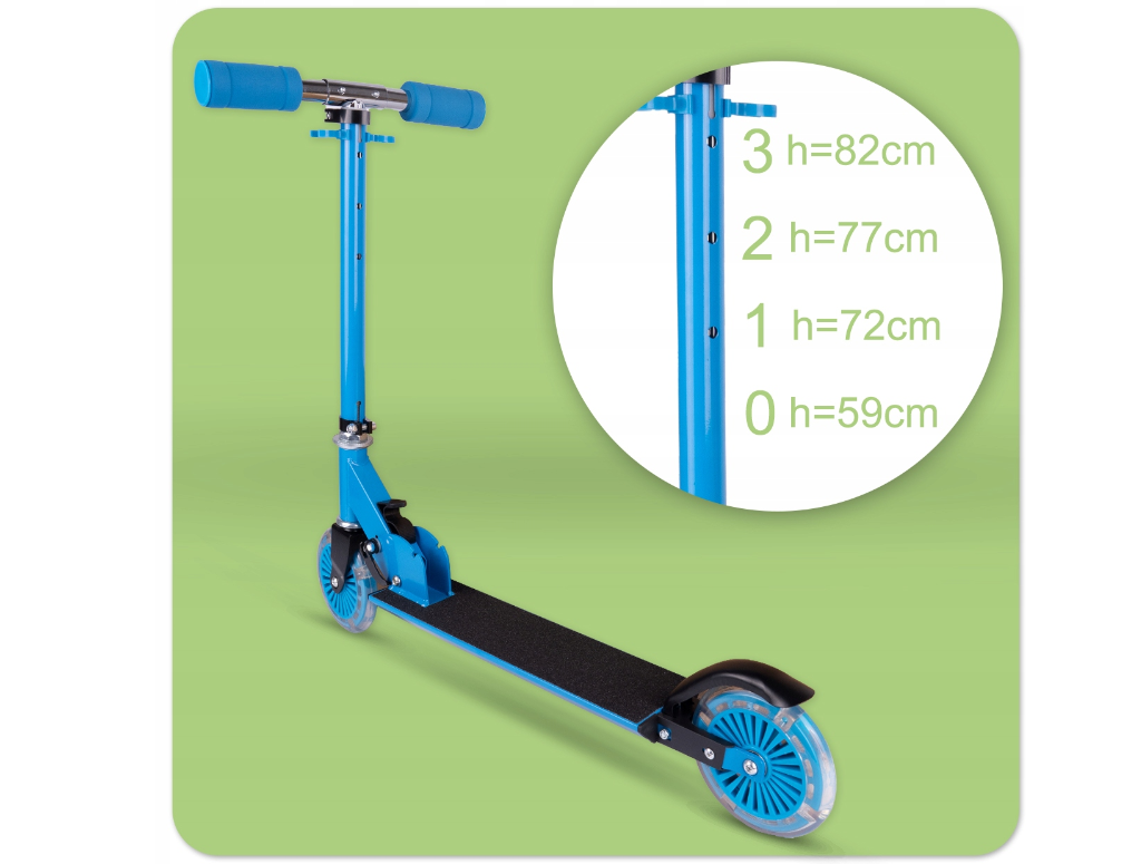 Trotineta are un ghidon reglabil care iti permite sa-i reglezi inaltimea la inaltimea copilului. Cand este desfasurat, trotineta are 59 cm inaltime. Are trei niveluri de reglare (72 cm, 77 cm, 82 cm) care permit utilizarea confortabila si ergonomica a scuterului de catre copii de diferite varste si inaltimi. Datorita acestui lucru, scuterul „creste” odata cu copilul, ceea ce o face o investitie pe termen lung.