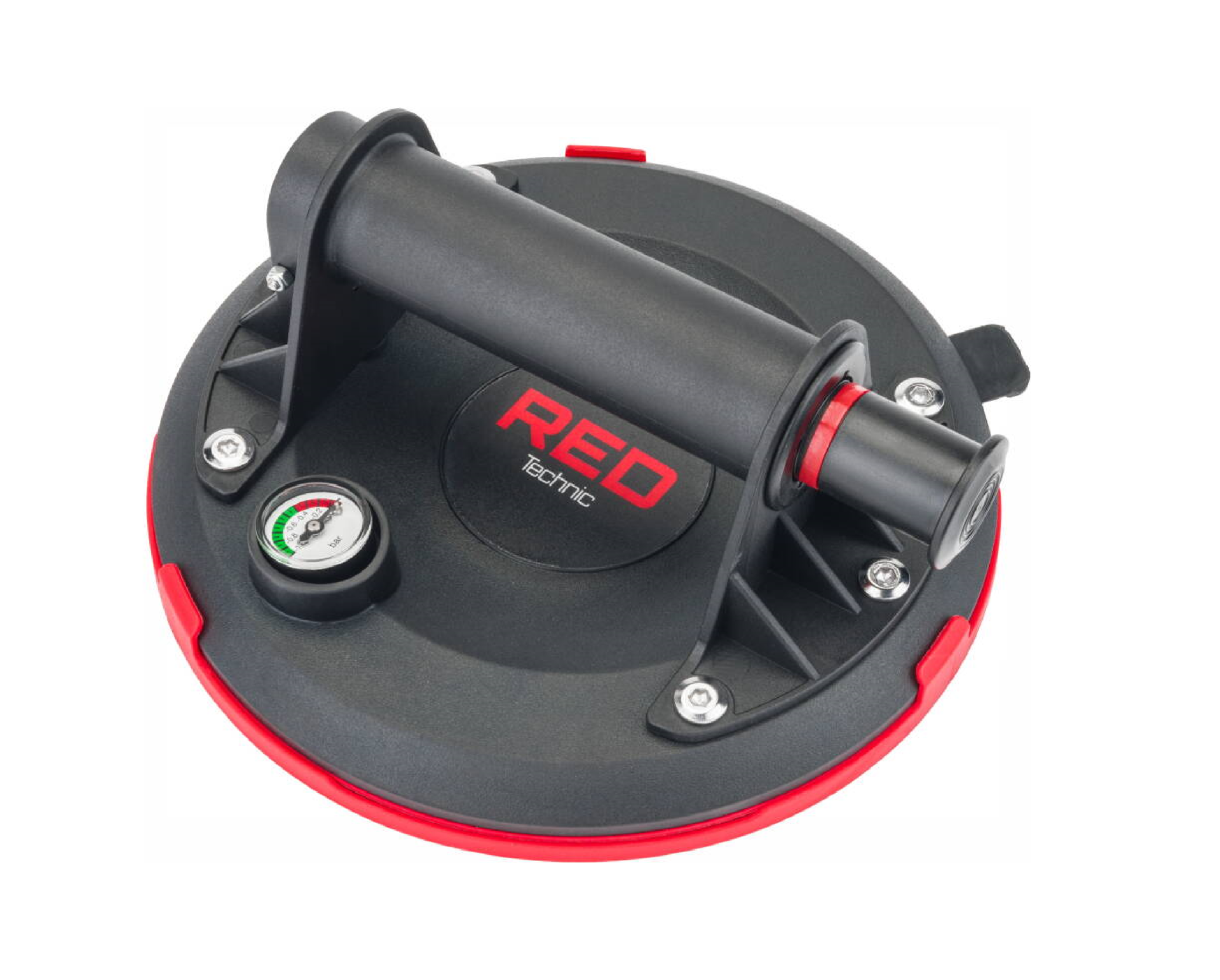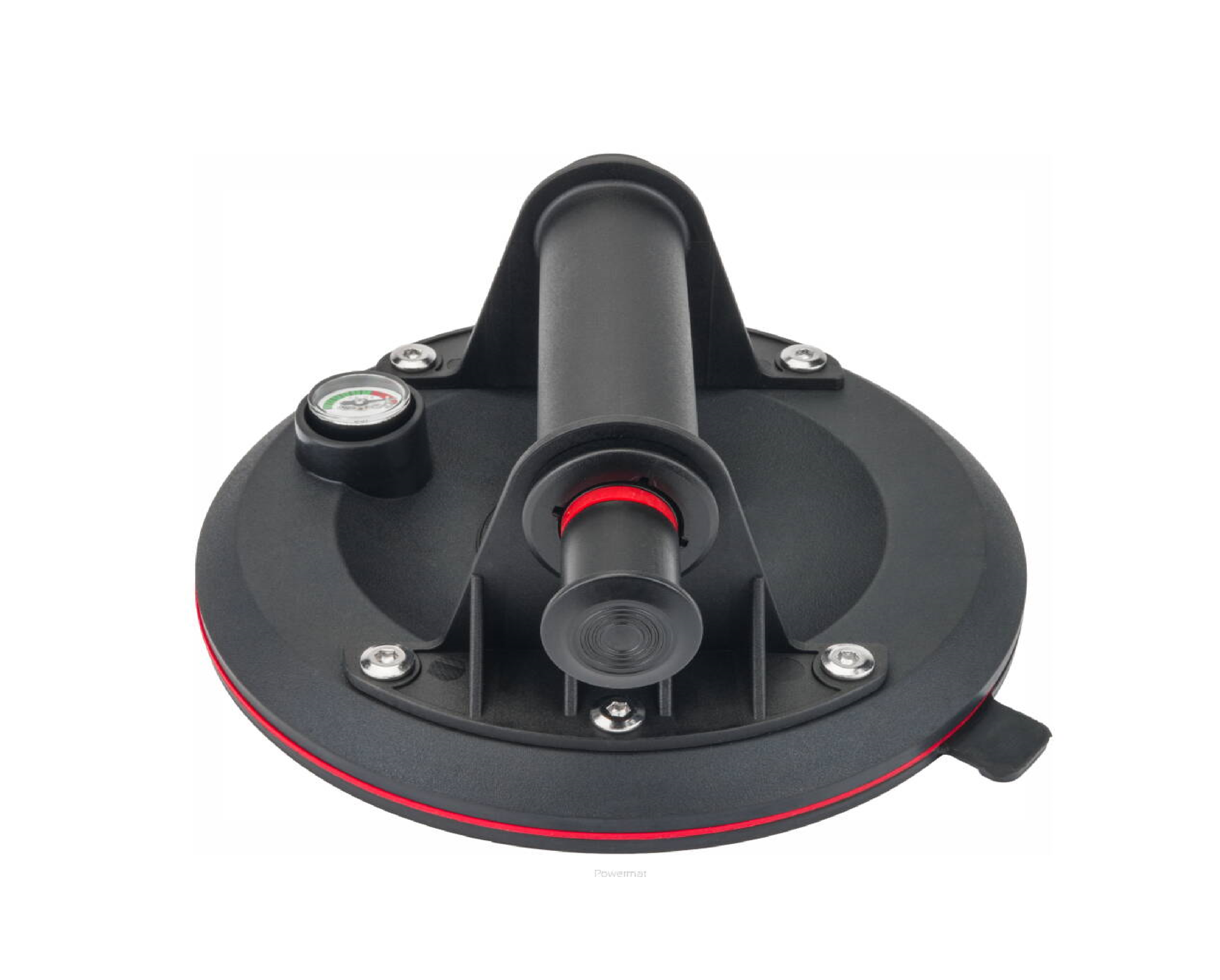Manerul cu diametrul de 200 mm are o capacitate de incarcare declarata de pana la 190 kg. Rezistenta la aspiratie trebuie controlata in timpul perioadei de aderenta mai lungi. Daca este vizibil un semn rosu, utilizati pompa pentru a creste vidul. Designul practic al instrumentului face posibila operarea acestuia cu o singura mana. Manerul confortabil mat adauga multa ergonomie.