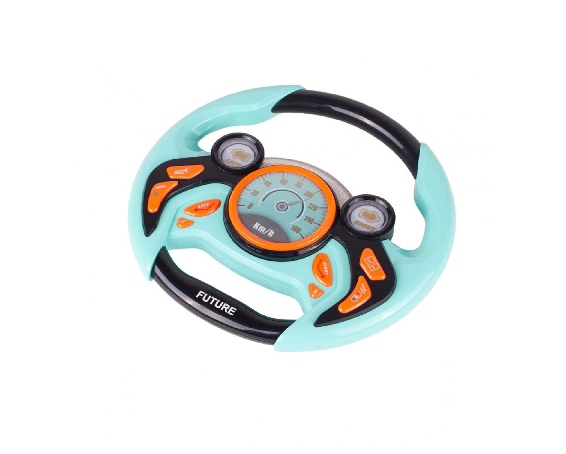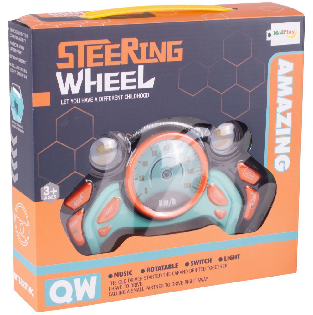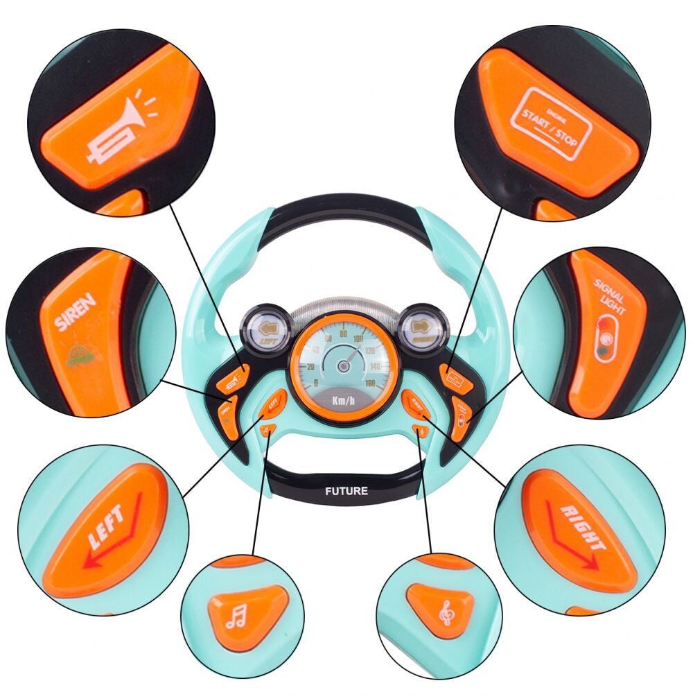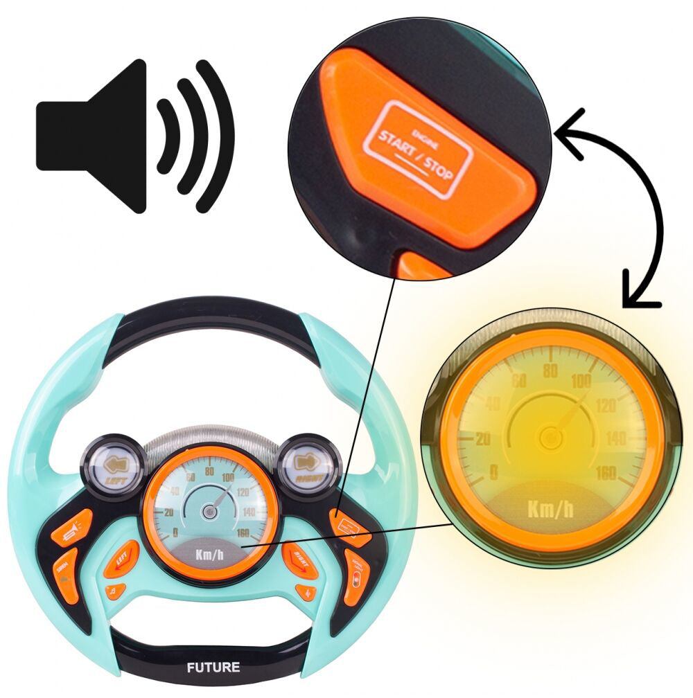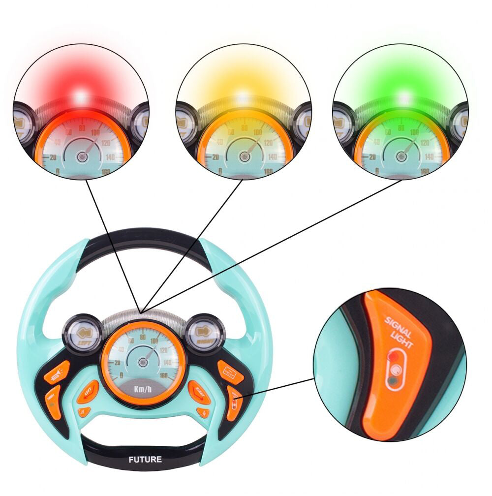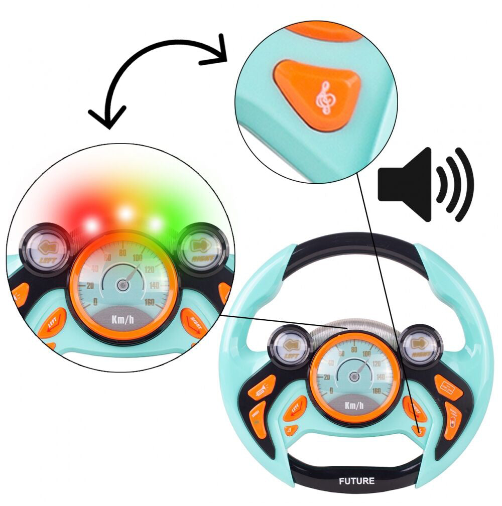 Volanul din plastic are o dimensiune ideala adaptata mainilor mici ale unui copil. Jucaria emite sunete (de exemplu, sirenele vehiculelor de urgenta) si reda melodii vesele in timp ce emite numeroase efecte de lumina.