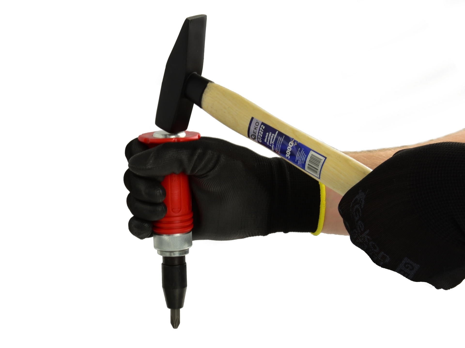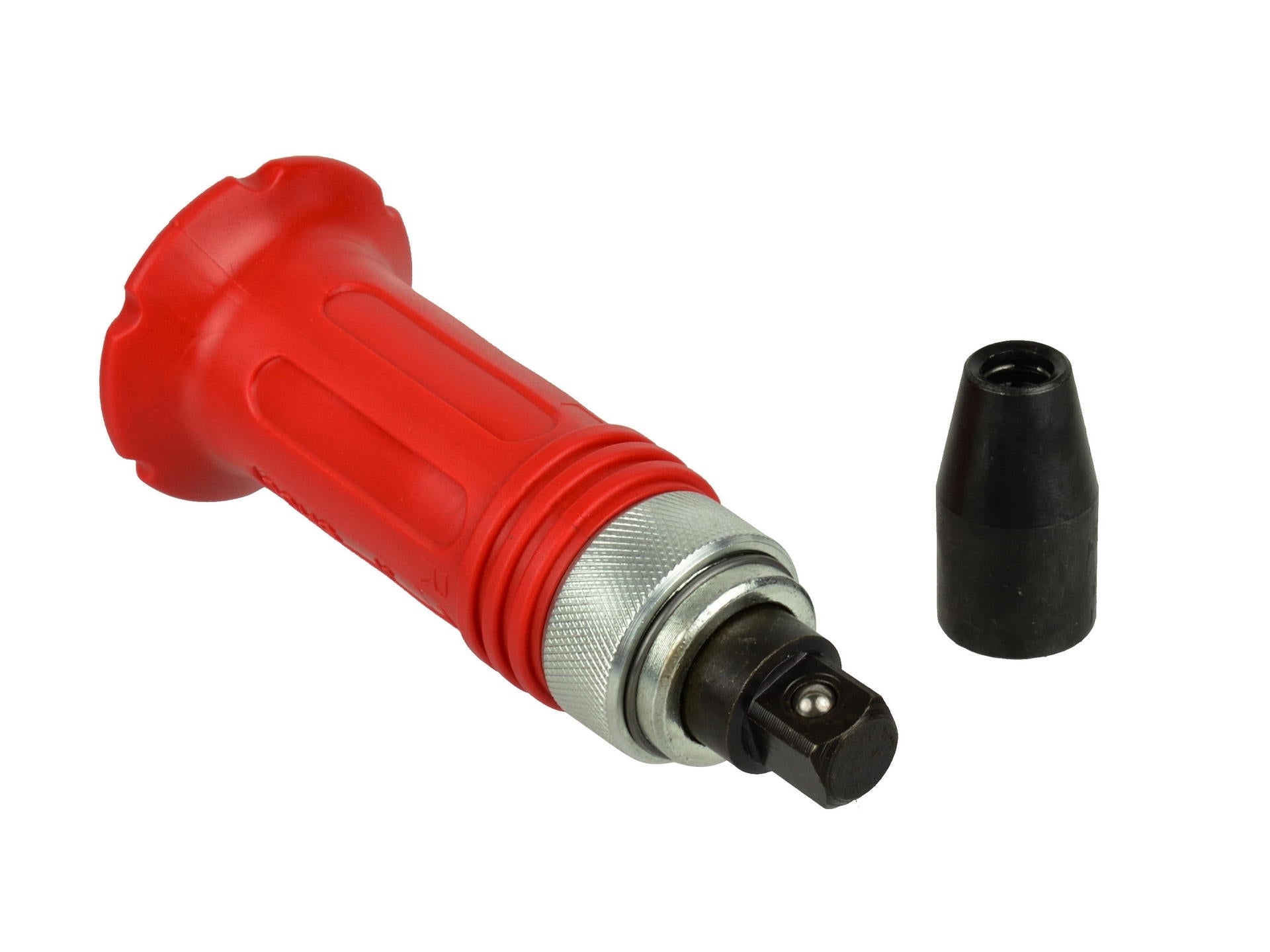 Șurubelniță 1/2 "cheie de impact cu o priză suplimentară pentru biți. Când o lovești cu un ciocan, șurubelnița generează o mișcare rotativă, ceea ce face mult mai ușor deșurubarea șuruburilor, șuruburilor și piulițelor confiscate. Șurubelnița de impact, datorită posibilității de a monta orice priză de 1/2 "pe ea, devine un instrument util în fiecare atelier profesional, dar și într-un garaj acasă.