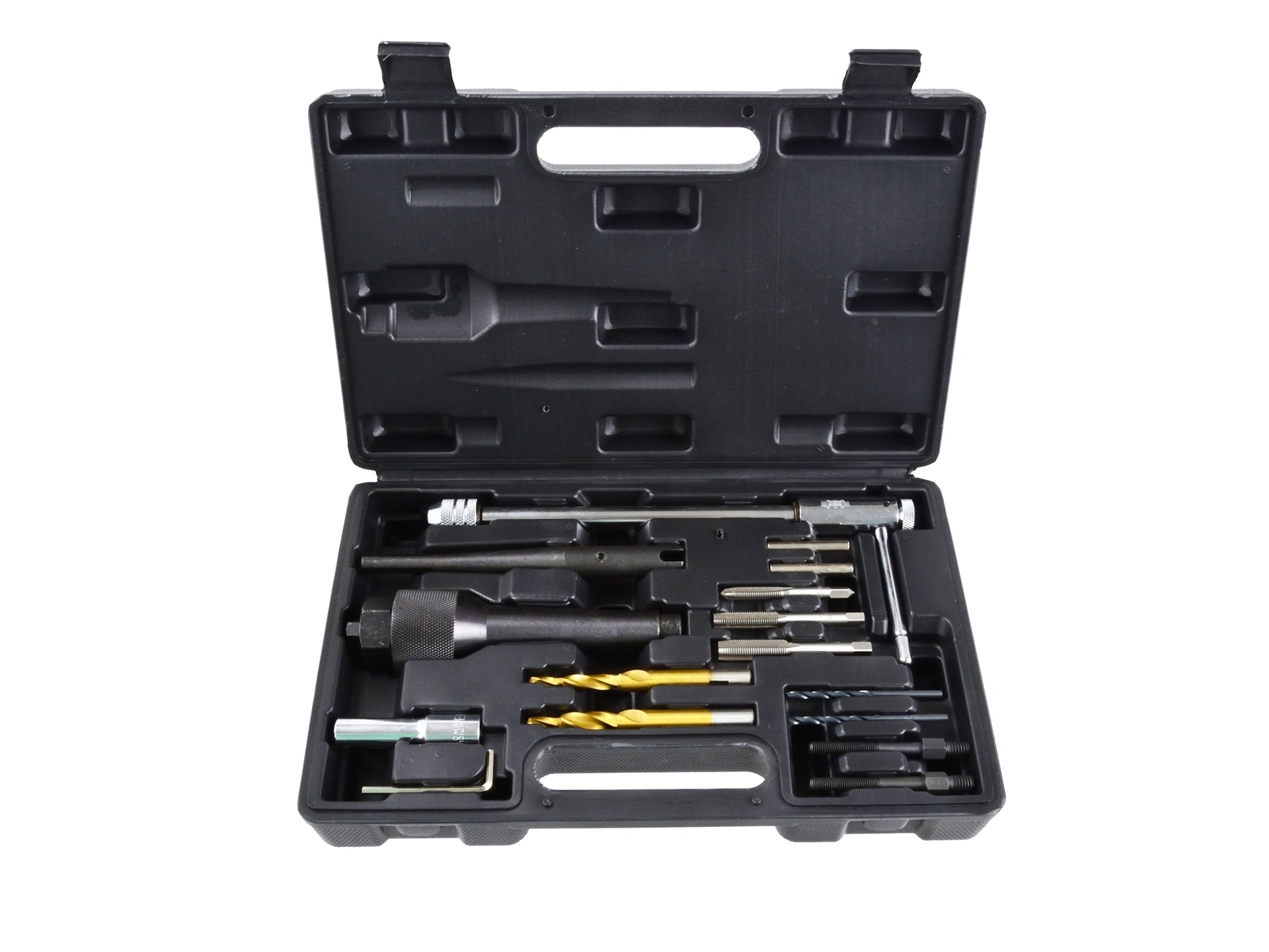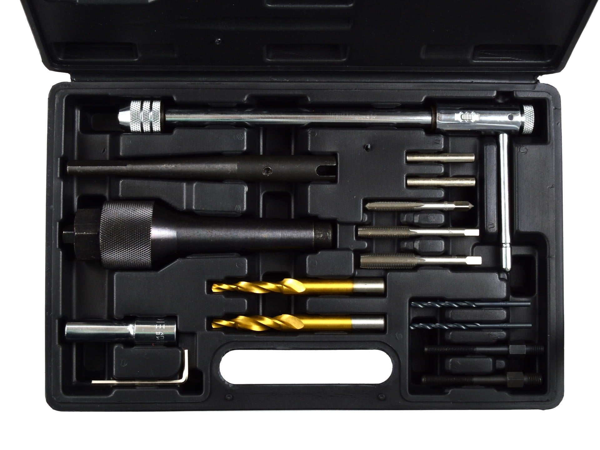 Set profesional pentru îndepărtarea bujilor incandescente rupte și repararea firului. Kitul permite demontarea bujilor incandescente cu filete M8 și M10. Reparația poate fi efectuată fără a fi necesară demontarea chiulasei - în acest caz, ar trebui instalat un adaptor pneumatic în locul injectorului corespunzător. Aerul comprimat va împiedica pătrunderea reziduurilor de tratament în camera de ardere.
