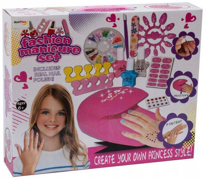 Va prezentam un set de înfrumusetare care este o solutie perfecta pentru toate mamele ale caror fiice îsi iau produsele cosmetice si, mai presus de toate, le plac lacurile de unghii - propriul lor set de manichiura. Un set multicolor de oje si bibelouri cu un uscator de unghii va castiga inimile tuturor fetelor. Culorile clasice, la moda si abtibildurile stralucitoare va vor permite sa creati o manichiura rece, care poate fi îndepartata într-un mod rapid, cu un demontator obisnuit.