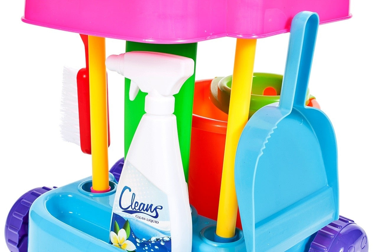 Oferim un kit de curățare cu accesorii, care este o combinație excelentă de distracție și util. Copiilor le place să imite adulții și, în timp ce se joacă, vor afla cât de important este să păstrezi casa curată. Luând setul nostru, nu vă veți convinge niciodată copilul să curățe din nou. Este un set pentru fiecare fetiță sau băiețel care dorește și vrea să ajute în timpul curățării. Culorile frumoase, estetica, realismul și manopera solidă garantează o distracție deosebită. Setul este o jucărie educațională care îl va face pe copilul tău să se obișnuiască cu ideea de comandă. Învață funcționarea și principiile de funcționare a aparatelor de uz casnic normale.