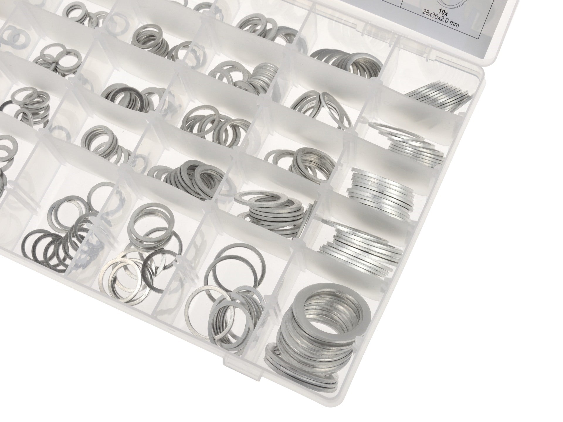 Caracteristicile produsului: 30 de dimensiuni diferite de șaibe, recipient de plastic cu compartimente practice.