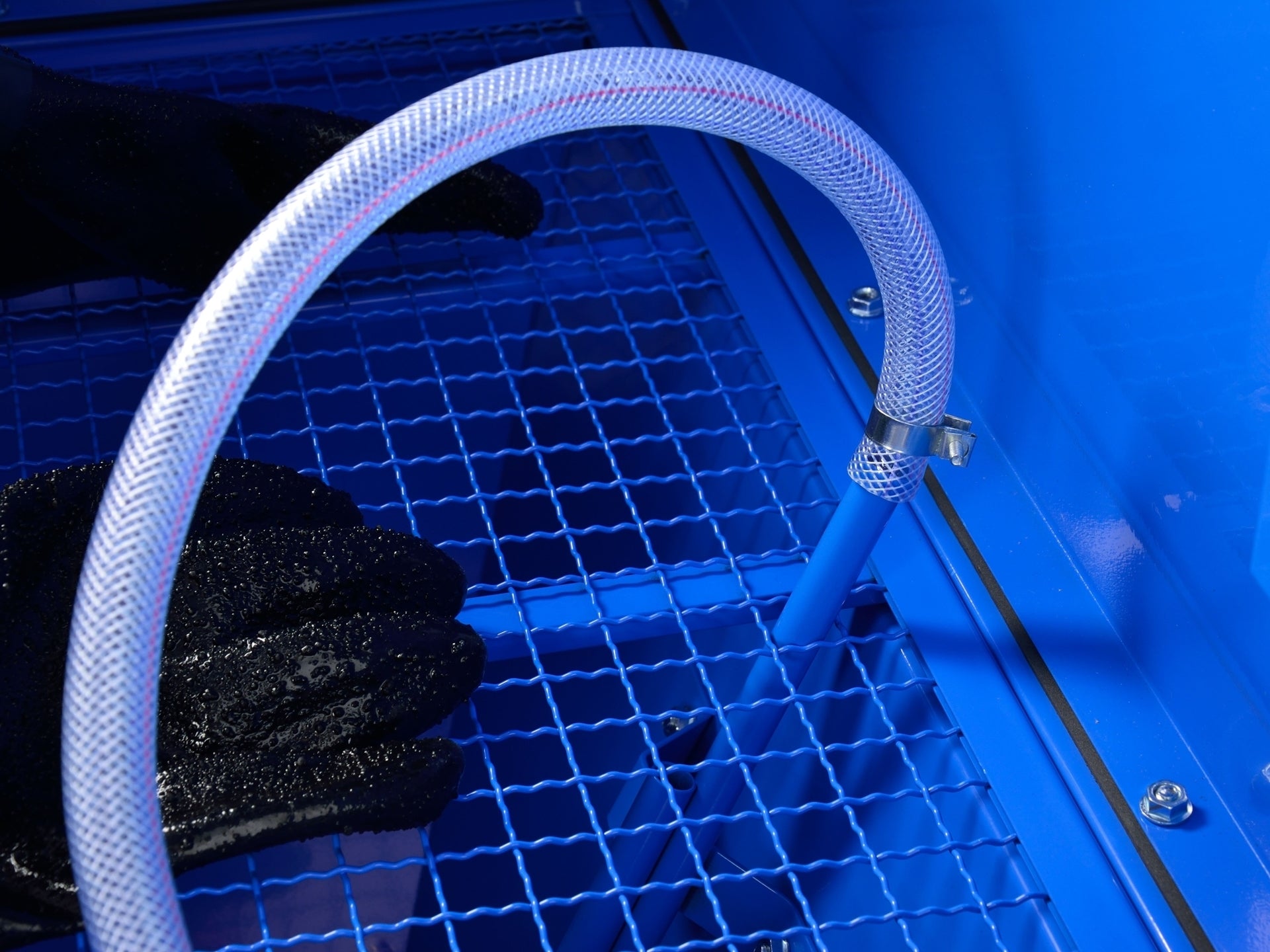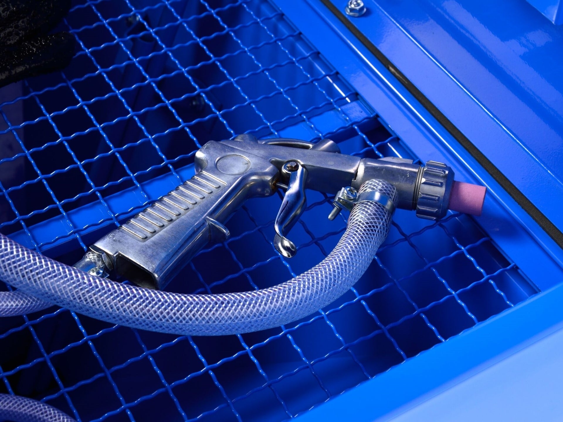 Sablator de cabină cu o capacitate de 220 litri, proiectat să funcționeze într-un ciclu abraziv închis. Dispozitivul perfect pentru sablarea obiectelor mici și mijlocii. Mașina are o cameră solidă și spațioasă, cu o ușă laterală, un pistol de sablare, patru duze din ceramică, mănuși de lucru de înaltă calitate, iluminare a spațiului de lucru și o fereastră mare - un ochi. Design compact și spațiu de lucru mare și spațios. Ușurință de utilizare remarcabilă, fiabilitate și siguranță în muncă. Funcționarea fără praf a dispozitivului este asigurată prin utilizarea garniturilor periferice. Furtunul de sablare este situat la baza recipientului de colectare. Gaura de scurgere permite schimbarea rapidă a materialului de sablare
