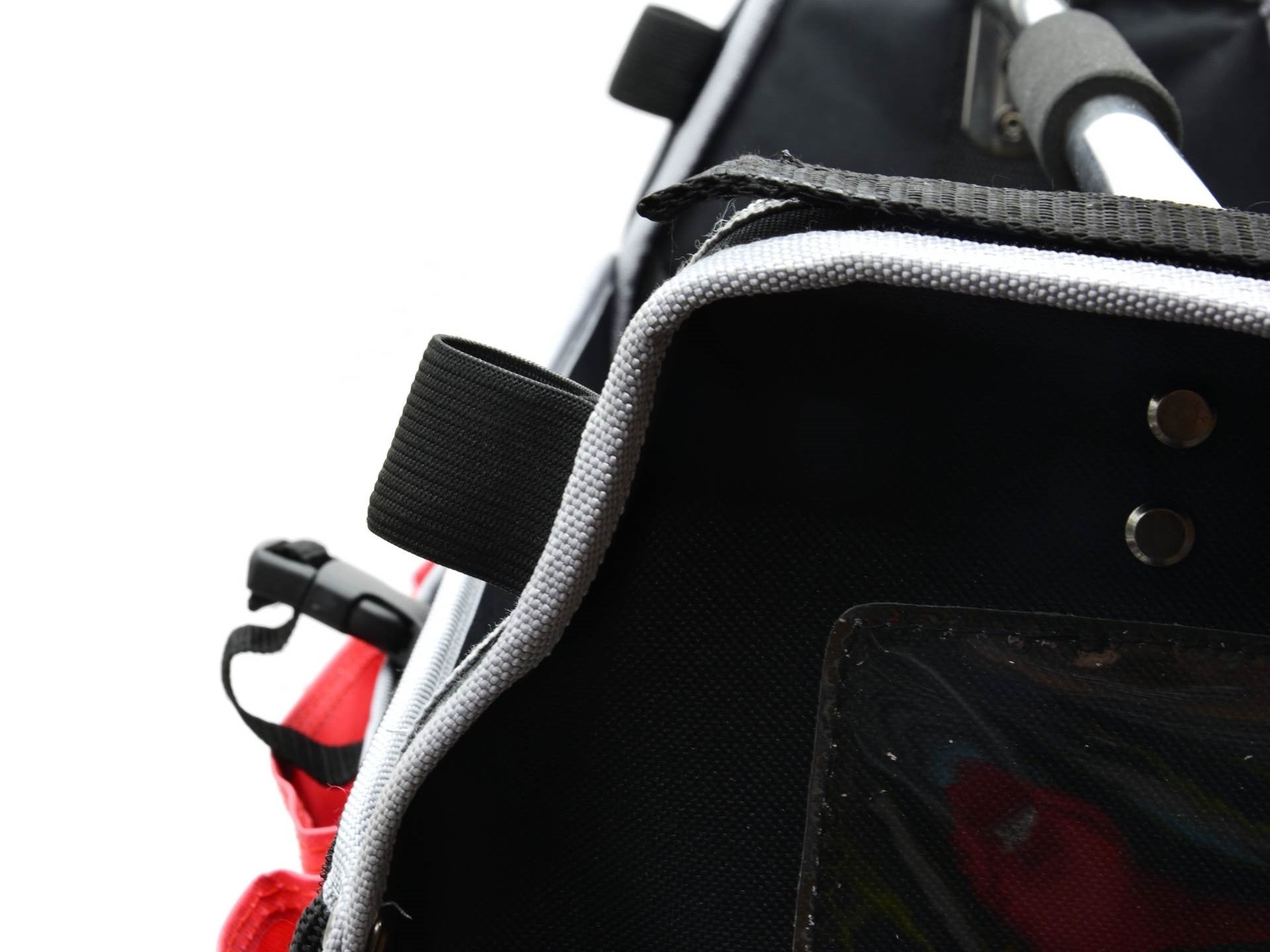 - În partea de sus a pungii, două bucle elastice și două curele cu fixare în velcro