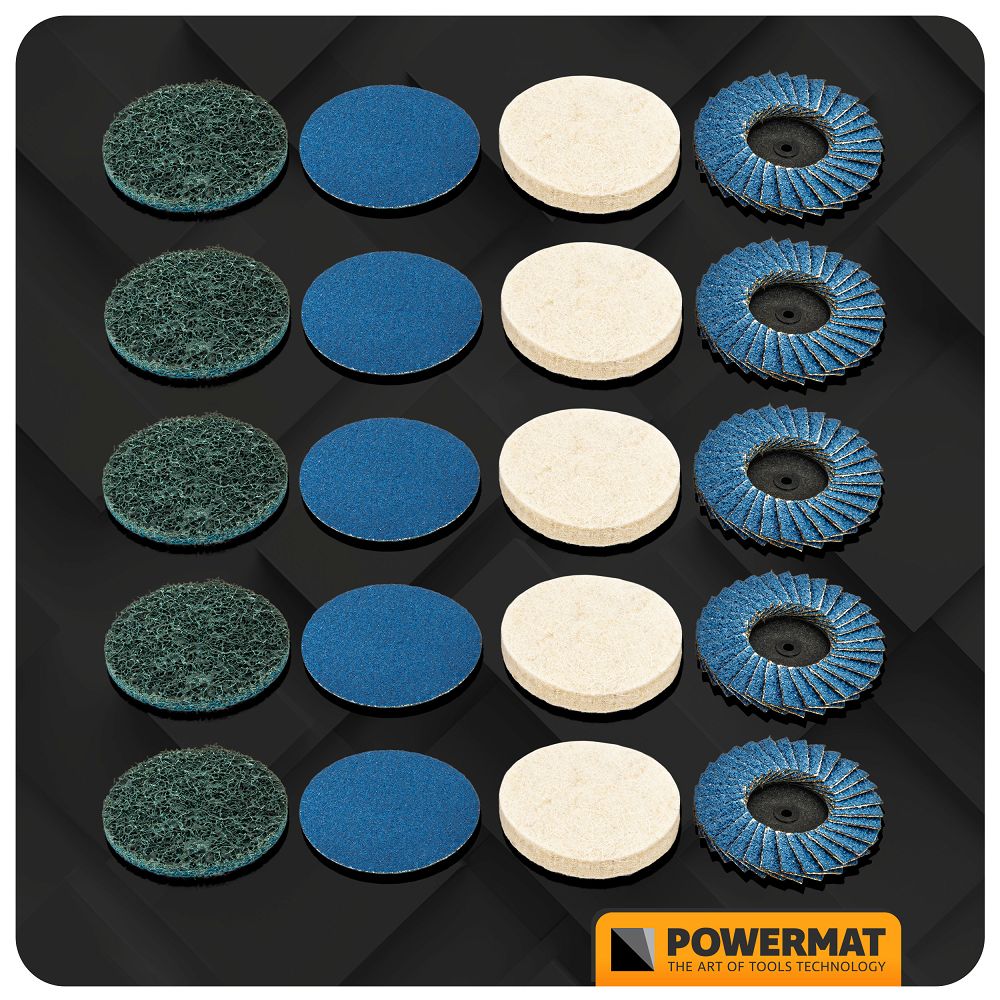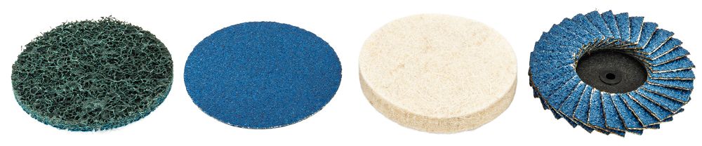 Setul include patru discuri diferite, a cate 5 bucati fiecare : un disc din material netesut pentru indepartarea ruginii si a vopselei, un disc abraziv pentru slefuire si nivelare, un disc din pasla pentru lustruire lucioasa si un disc lamelar pentru slefuirea intensiva a metalului.