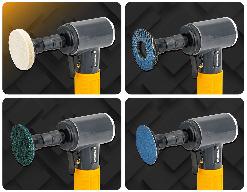 Intregul set permite: slefuirea, curatarea, lustruirea, ascutirea si intretinerea polizorului pneumatic, iar datorita varfurilor interschimbabile, este universal si potrivit pentru numeroase aplicatii in metal, lemn si materiale plastice.