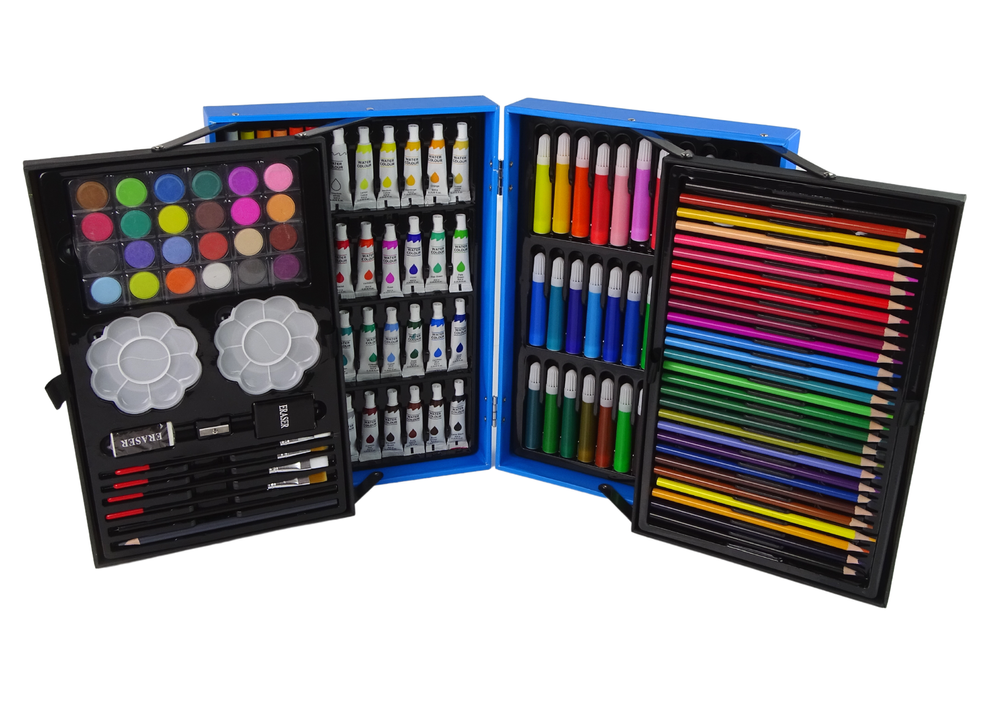 Contine 145 de piese, inclusiv creioane colorate, markere, vopsele si pasteluri in ulei – perfecte pentru desen, pictura si schitare.