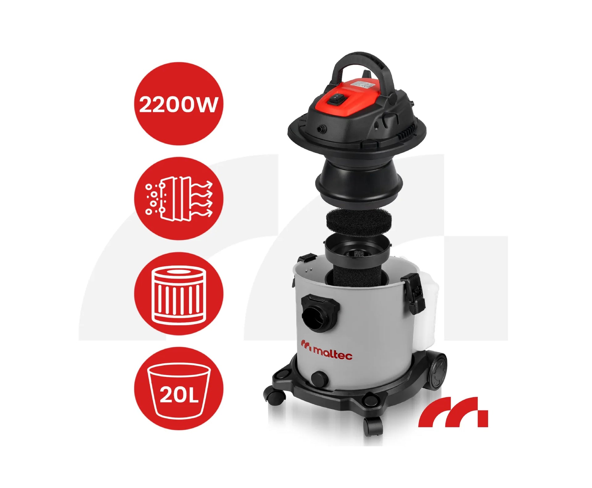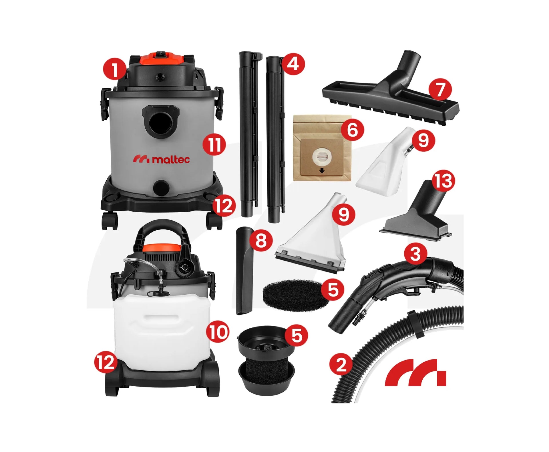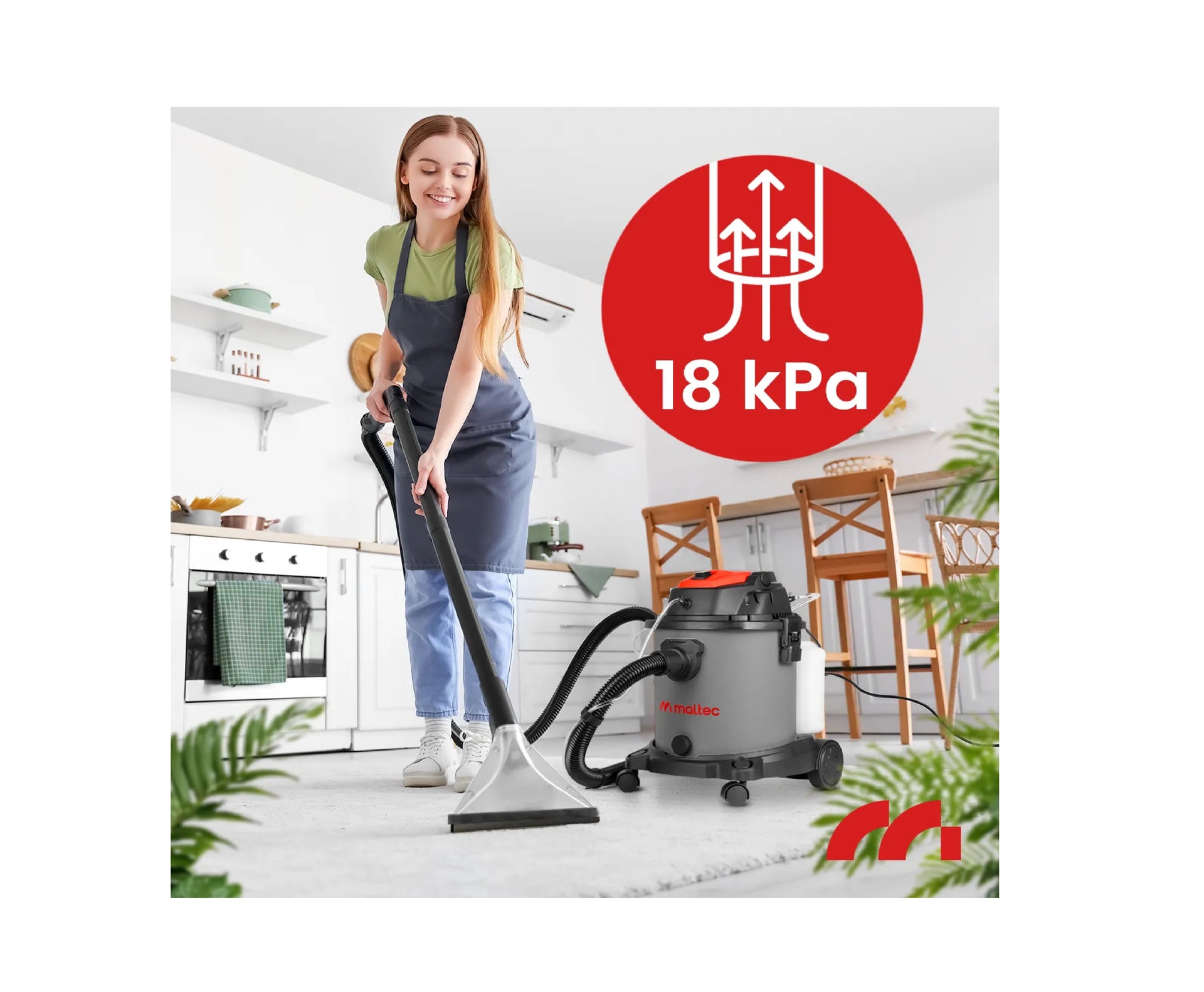MalTec MasterWash2200W este un aspirator profesional 4 in 1 care combina aspirarea uscata, curatarea umeda, curatarea tapiteriei si functia de suflare. Cu puterea sa puternica de aspirare de 2200 W , capacitatea mare a rezervorului si sistemul eficient de filtrare, poate face fata oricarei sarcini - fie acasa, la birou, in garaj sau in masina.