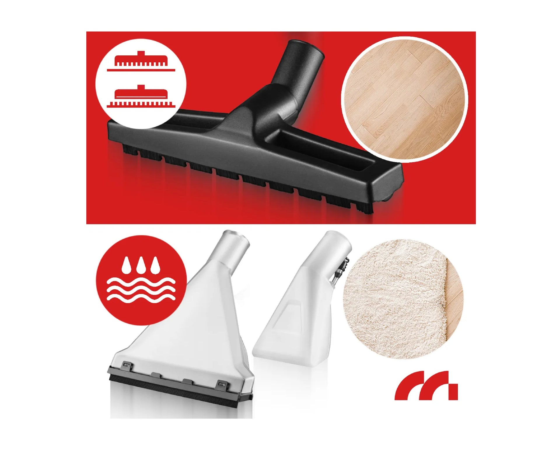 Datorita celor doua duze de aspirare – una ingusta (95 mm) si una lata (210 mm) , puteti curata cu usurinta tapiteria mobilei, scaunele auto si covoarele mari. Pistolul de pulverizare incorporat , cu buton pentru detergent, permite pulverizarea precisa a agentului de curatare exact acolo unde este nevoie. Combinata cu o putere de aspirare de pana la 18 kPa, puteti indeparta chiar si murdaria si petele adanc inradacinate.