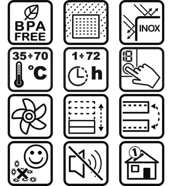- Puterea dispozitivului, adaptata optim dimensiunii si scopului sau , un incalzitor cu ventilator eficient si o structura de tip grila a rafturilor asigura circulatia libera a aerului intre niveluri si, prin urmare, o uscare eficienta si uniforma : fara supraincalzire inutila (reducere de costuri) si „fierbere” nefavorabila a produselor.
