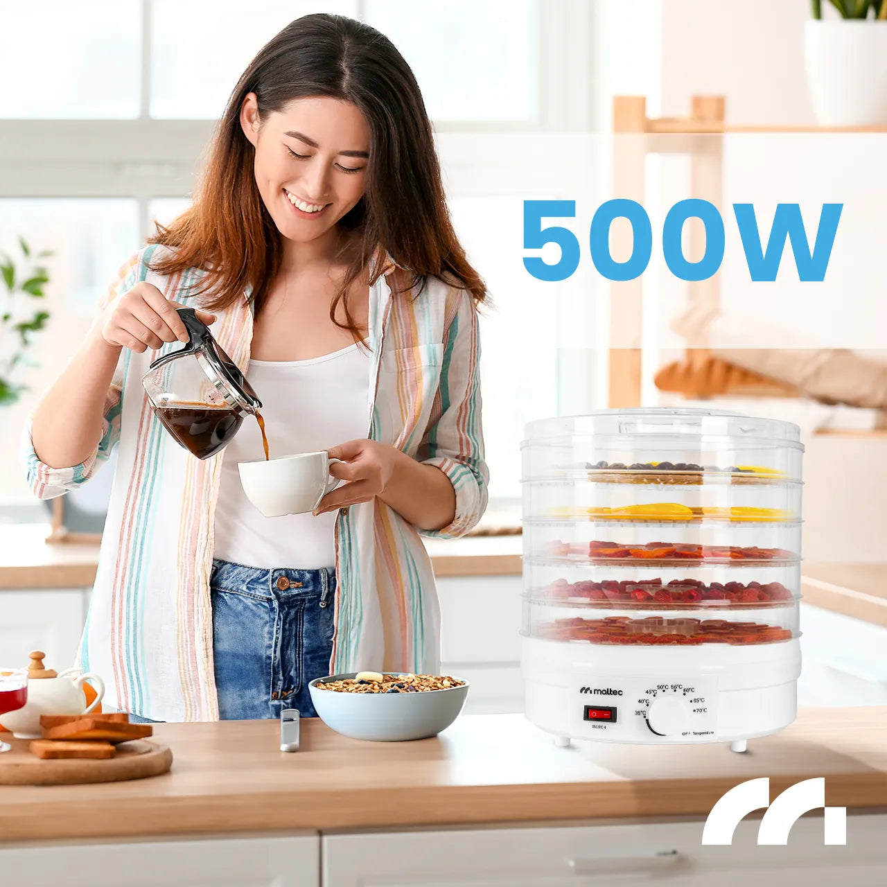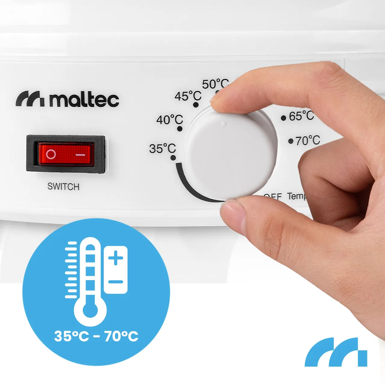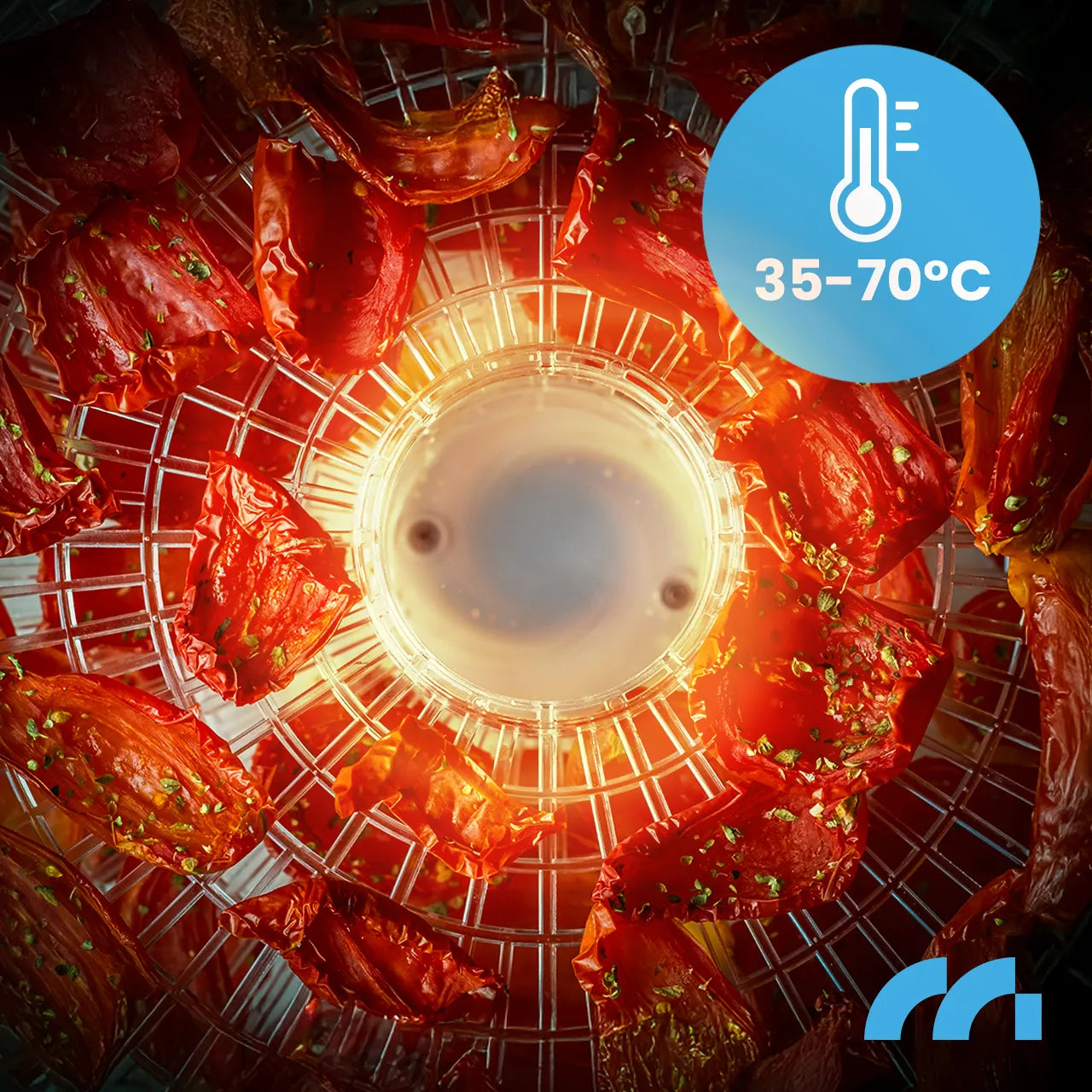 - Operarea deshidratorului este incredibil de simpla - un singur comutator si un buton de temperatura convenabil ofera control complet asupra procesului de uscare. Cu reglarea manuala a temperaturii pe 8 niveluri, de la 35°C la 70°C , puteti ajusta cu usurinta conditiile de functionare ale dispozitivului in functie de tipul de alimente pe care le uscati - de la ierburi delicate la fructe si legume suculente.