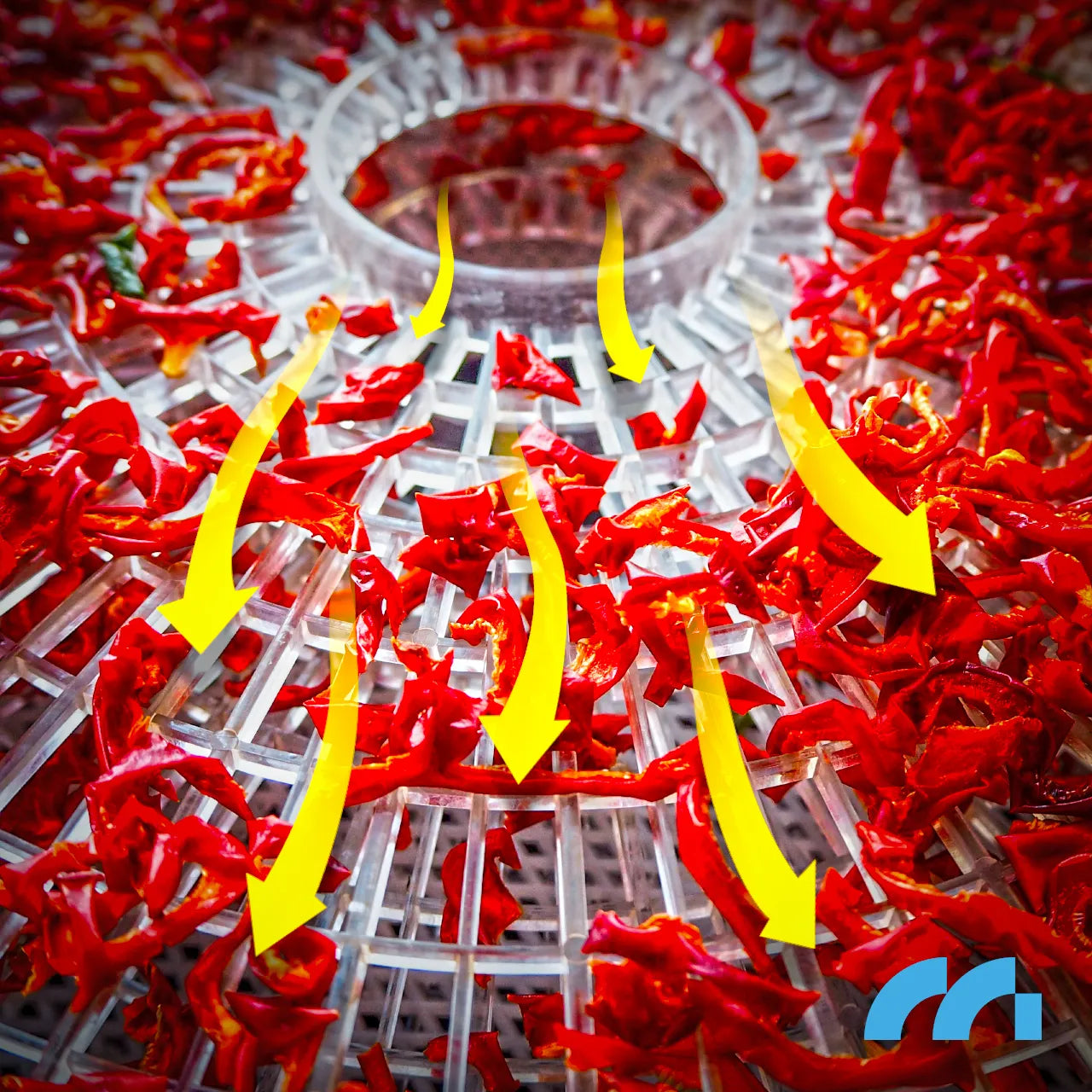 Un deshidrator de ciuperci de uz casnic functioneaza pe principiul fluxului de aer cald generat din partea inferioara a dispozitivului. Aerul este suflat la toate „nivelurile” deshidratorului si ar trebui distribuit uniform.