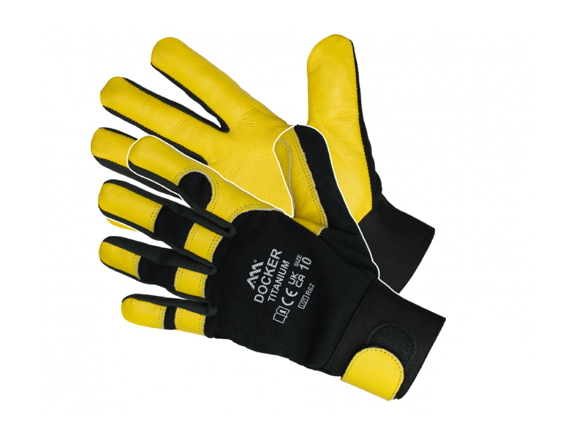Manusi de protectie, cu cinci degete, din piele de vaca boabe galbene de calitate superioara , cu tricot elastic cu spandex negru pe partea din spate .