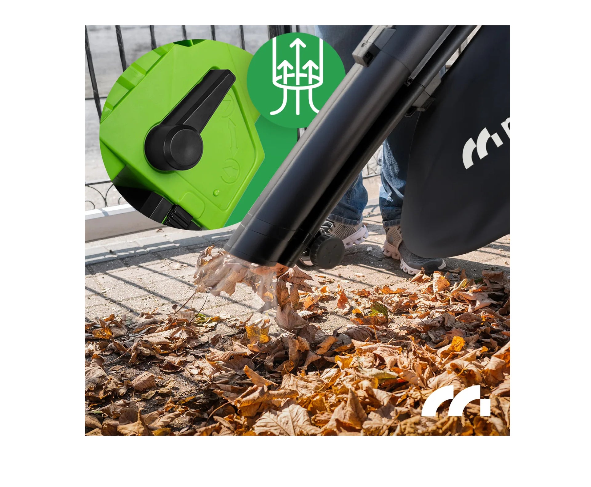 Acest dispozitiv eficient curata frunzele, acele de pin si crengutele mici . Suflanta/aspiratorul ridica eficient resturile de pe pamant, le sufla intr-un singur loc si apoi le absoarbe intr-un sac cu functie de maruntire. Fluxul de aer ajuta la uscarea usoara a frunzelor mai usoare si umede.