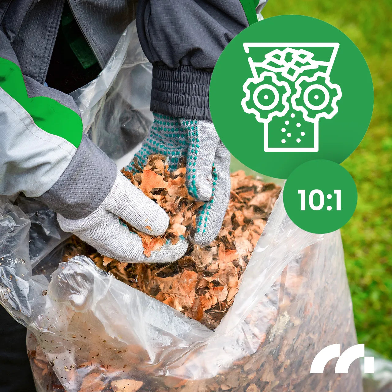 Cutitul incorporat zdrobeste materialul aspirat si ii comprima volumul intr- un raport de 10:1 , ceea ce se traduce printr- o golire mai putin frecventa a sacului si o gestionare mai usoara a deseurilor (ideal pentru compost sau mulci).