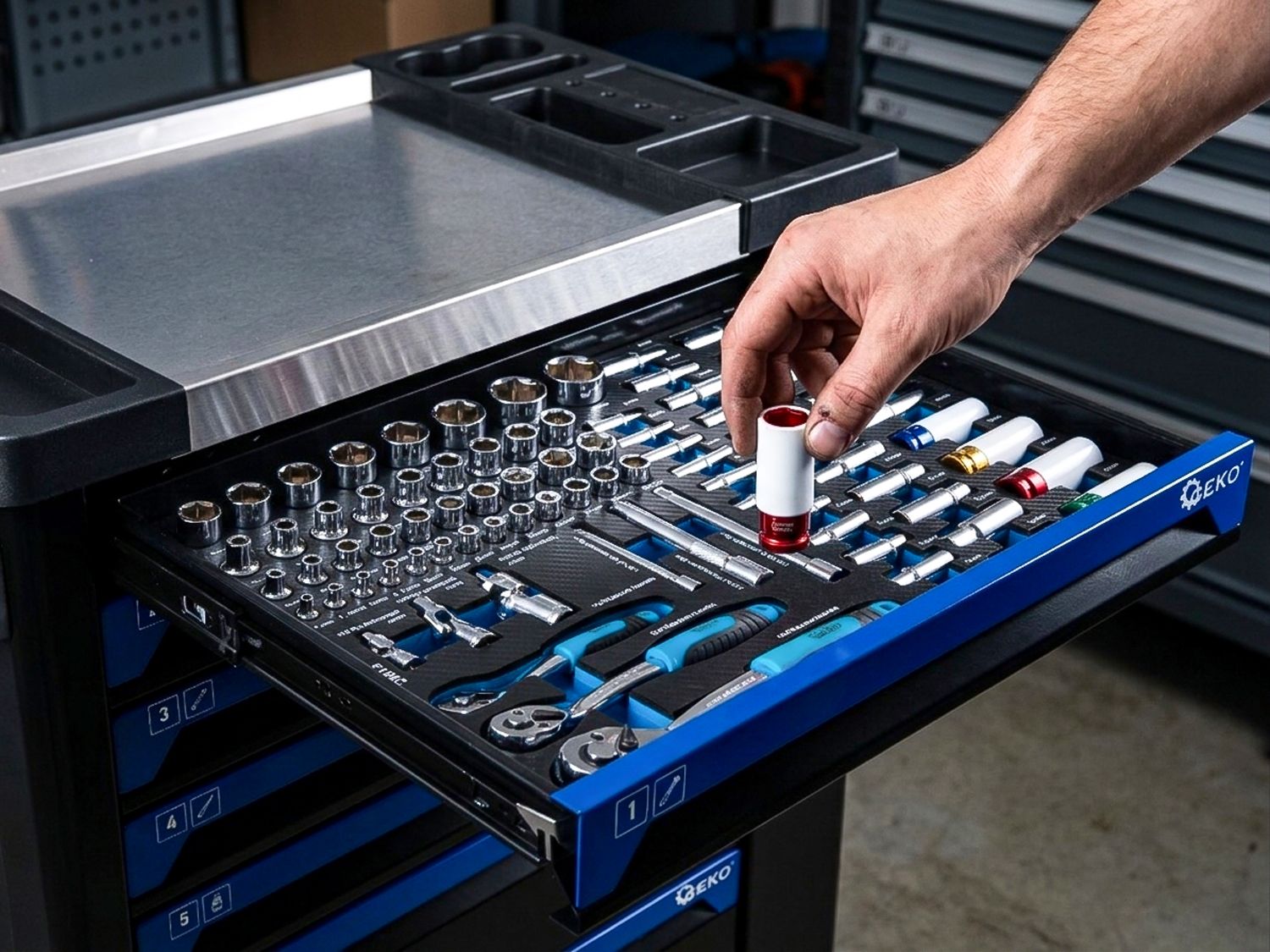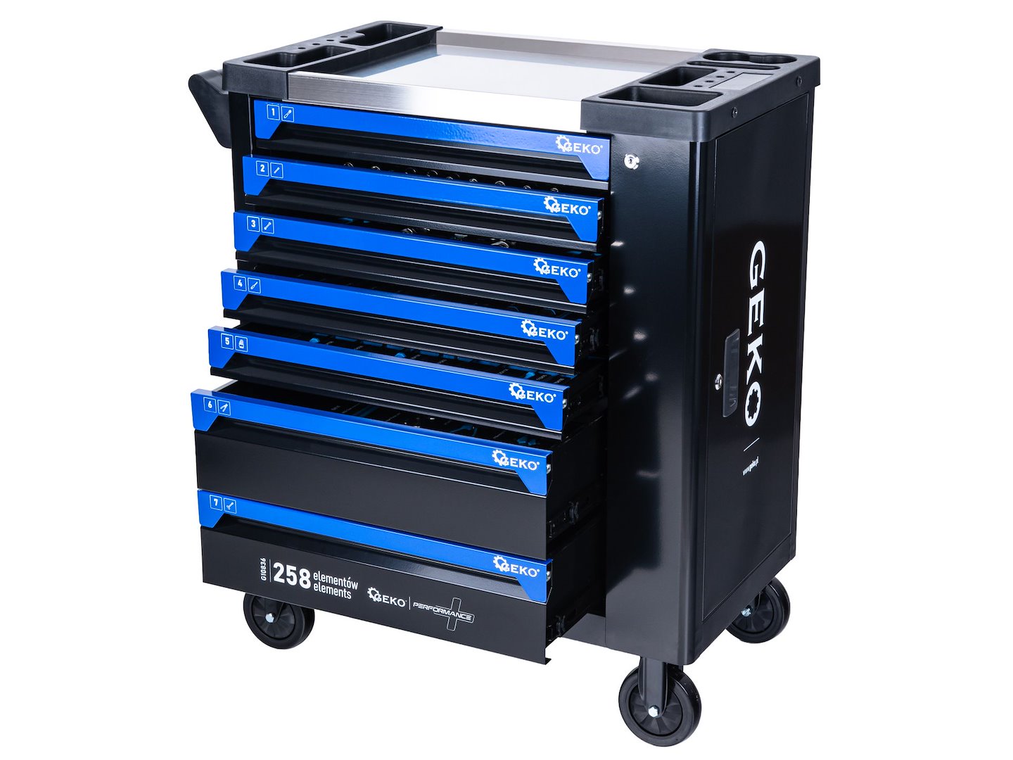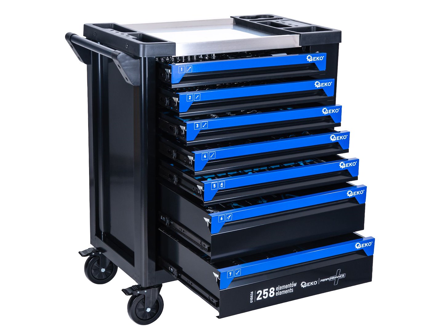 Dulap de atelier cu echipamente - un carucior pentru scule echipat cu sapte sertare cu organizatoare, care contine 258 de unelte. Structura este fabricata din otel vopsit in camp electrostatic, ceea ce creste rezistenta la impacturi, zgarieturi si conditii de lucru din atelier.