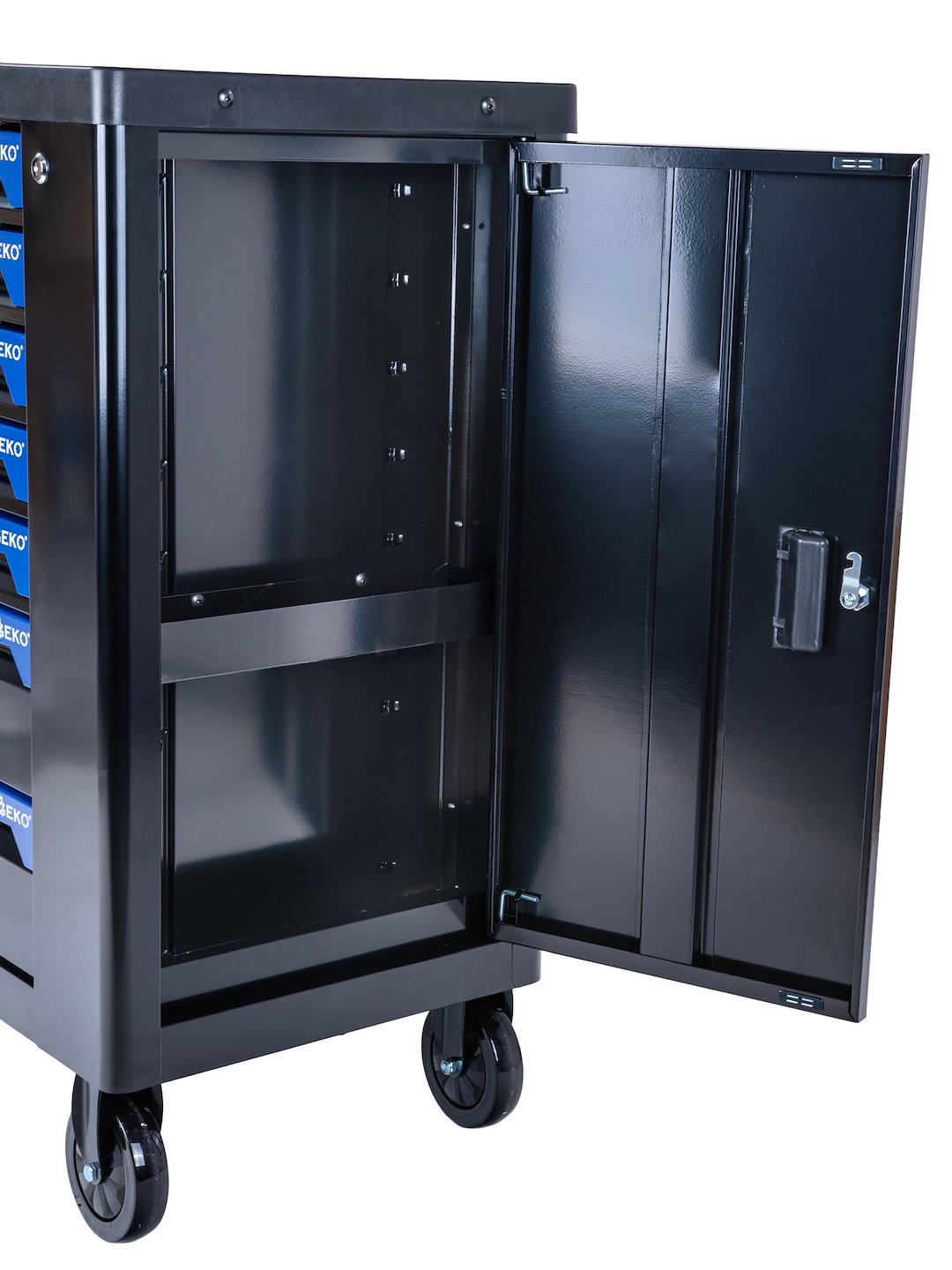 Mobilitatea este asigurata de roti de 120 mm (2 fixe + 2 pivotante cu frane) si de un maner de transport, facilitand mutarea dulapului in orice locatie din atelier sau garaj. Un sistem de inchidere centralizata securizeaza simultan toate sertarele.