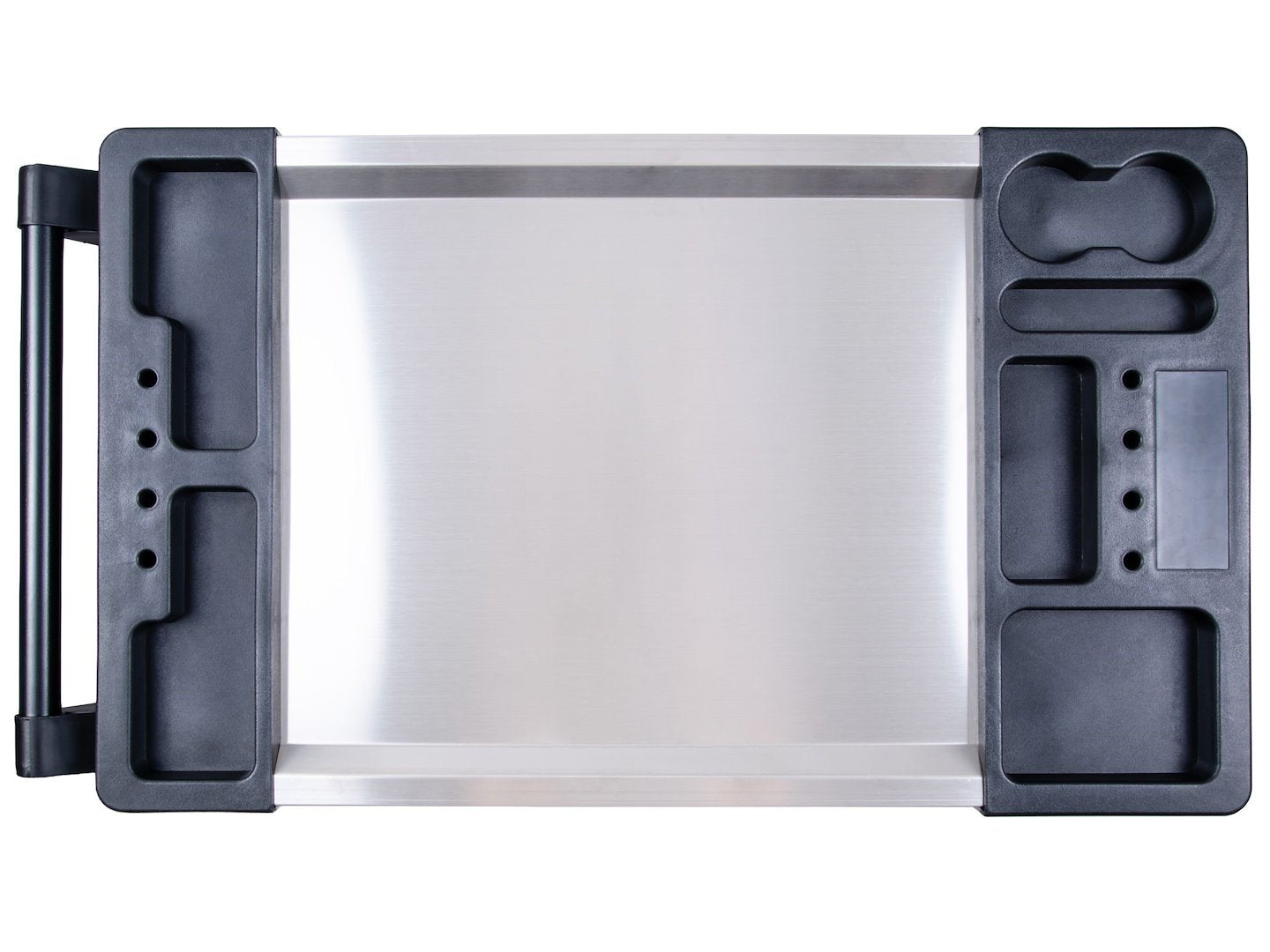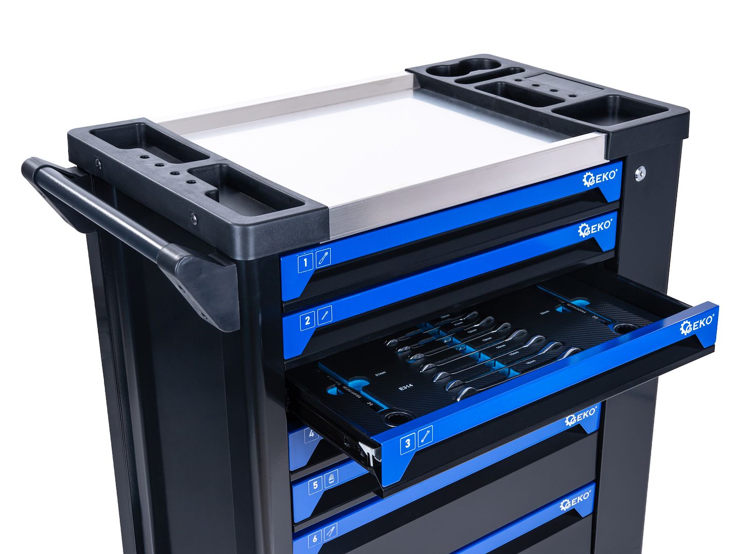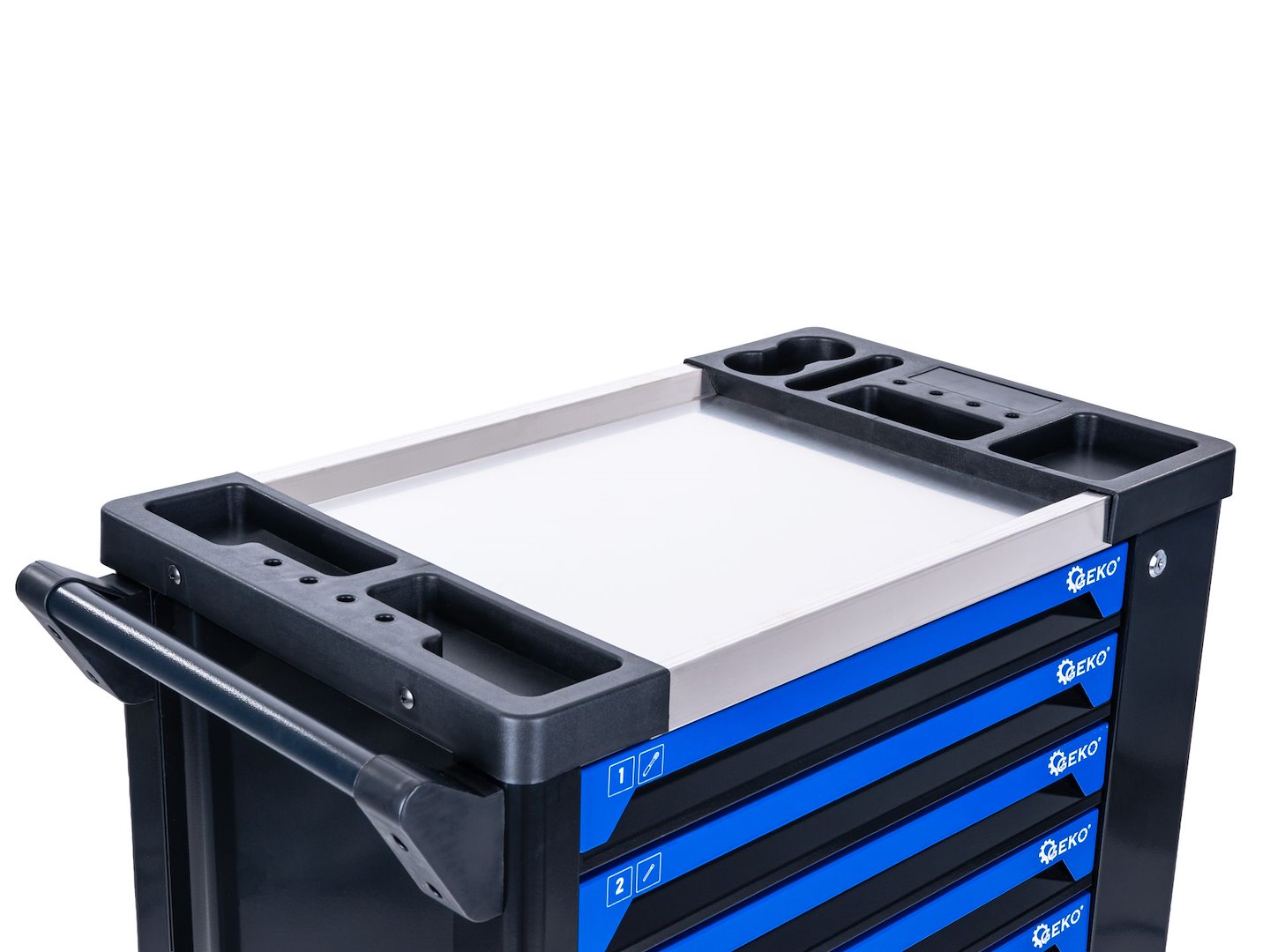 In partea de sus se afla un blat de lucru din otel inoxidabil cu dimensiunile de 470 × 450 mm, care va permite sa pregatiti uneltele sau sa efectuati lucrari minore de service fara a fi nevoie de o masa suplimentara.