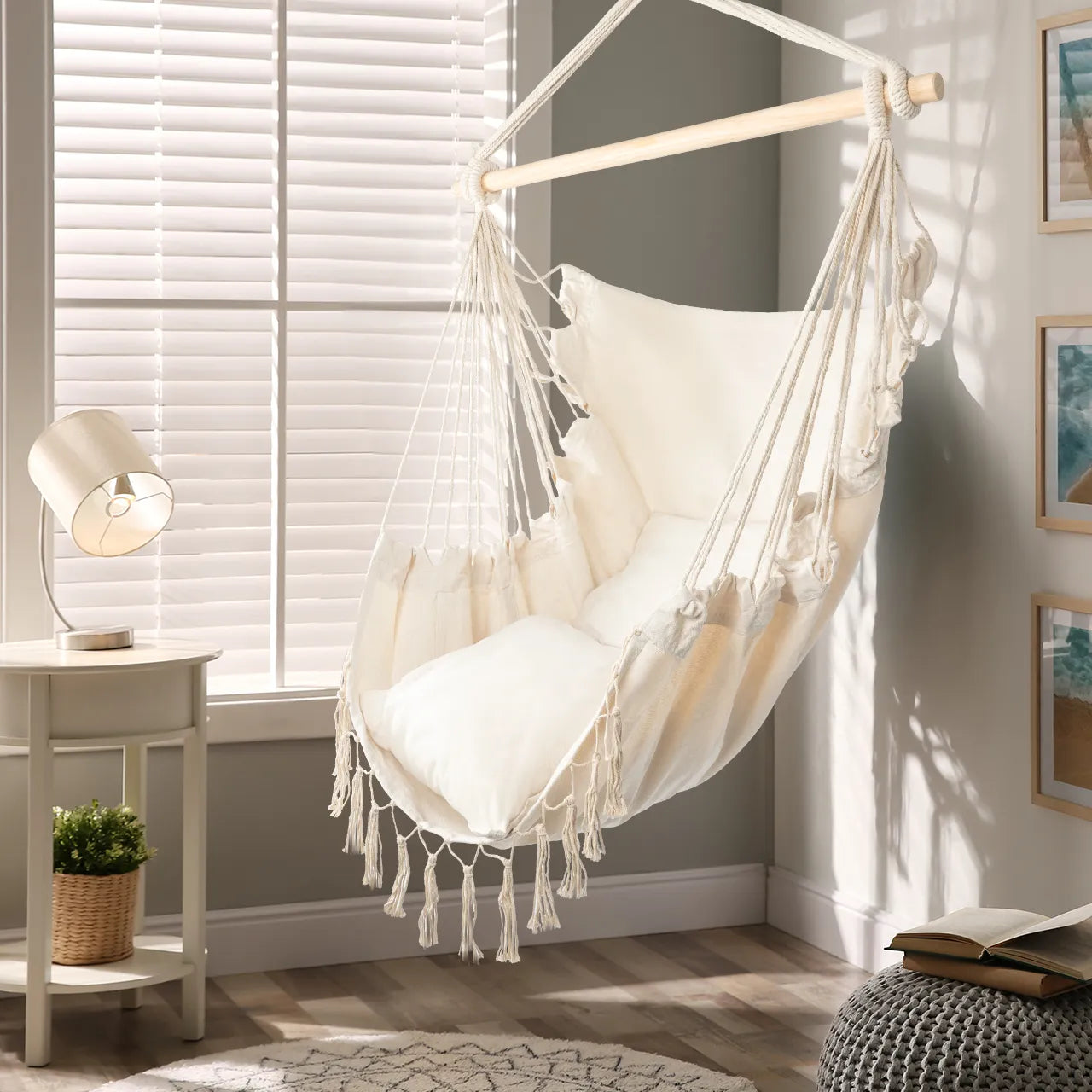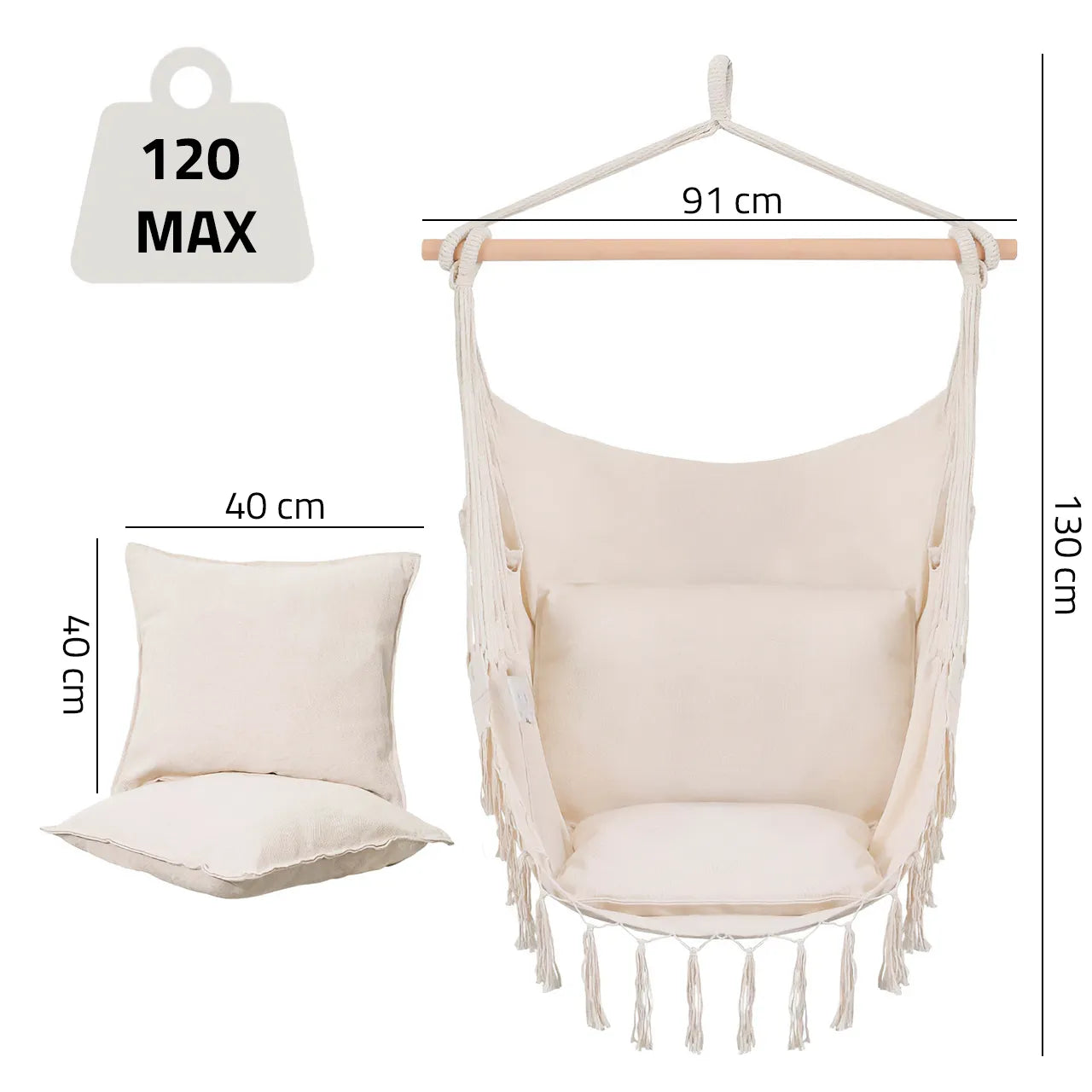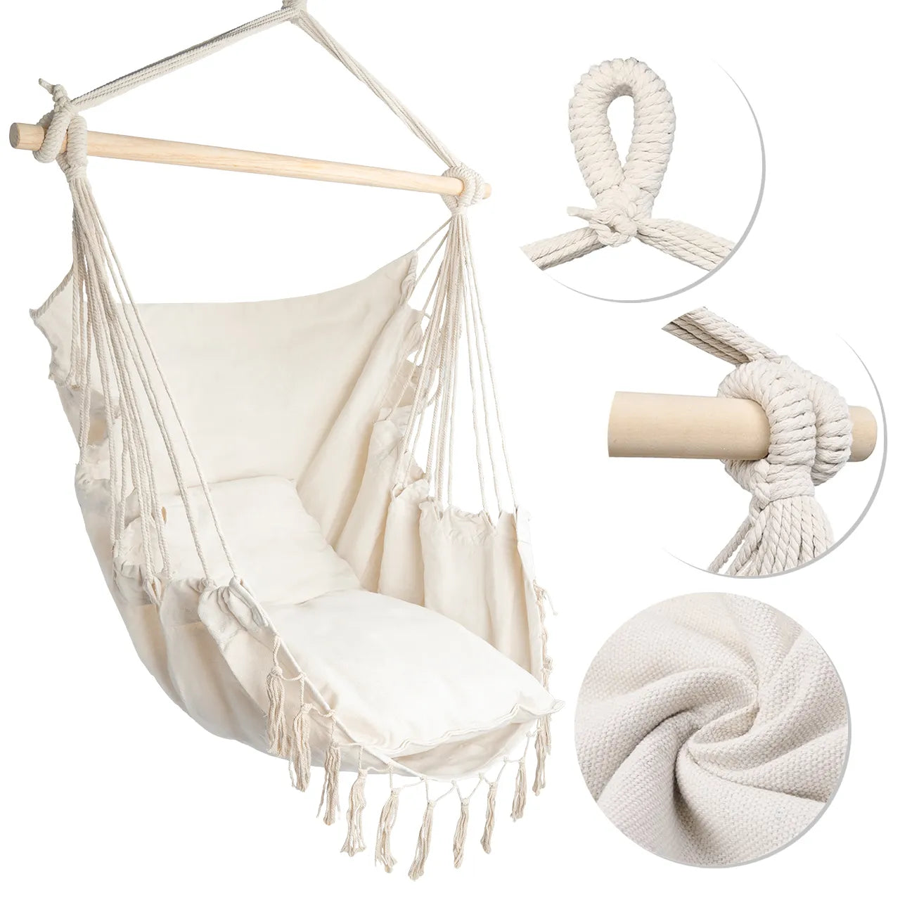 Cadrul din lemn face ca hamacul sa fie nu doar placut din punct de vedere estetic, ci si mai functional. Acesta ofera stabilitate, prevenind in acelasi timp incurcarea corzilor, sporind si mai mult durabilitatea acestui scaun unic.