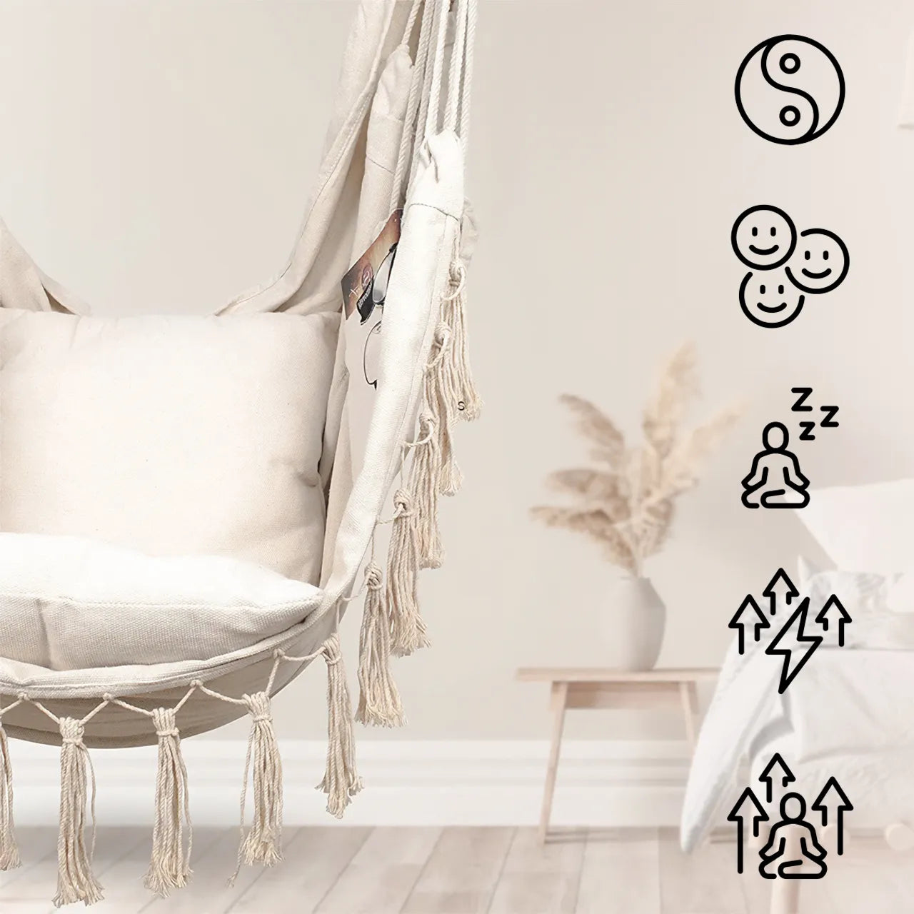 Fotoliul suspendat va permite sa va creati propriul refugiu plin de frumusete, confort si inspiratie, invitandu-va sa creati momente de neuitat inconjurati de natura si design estetic.