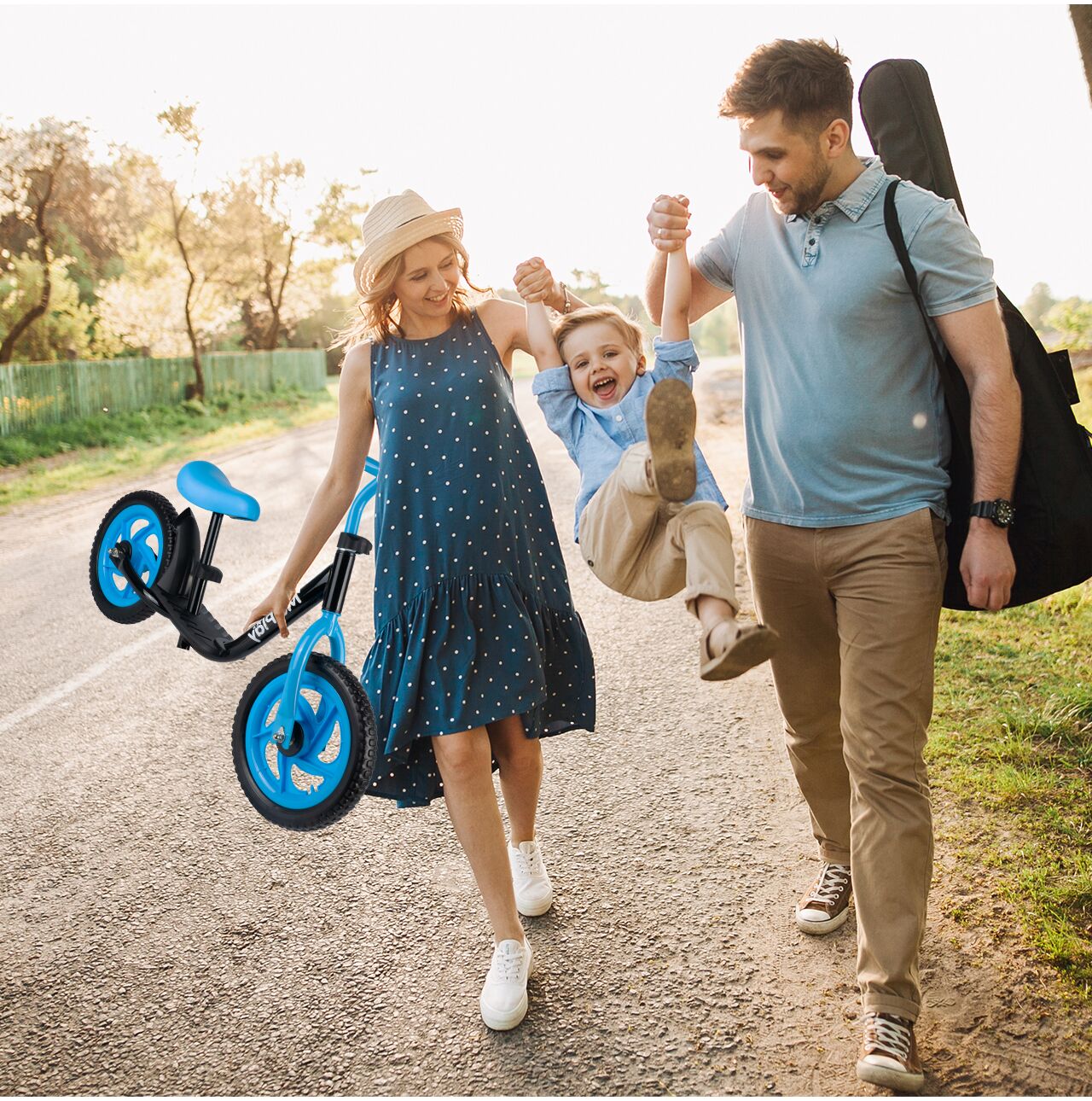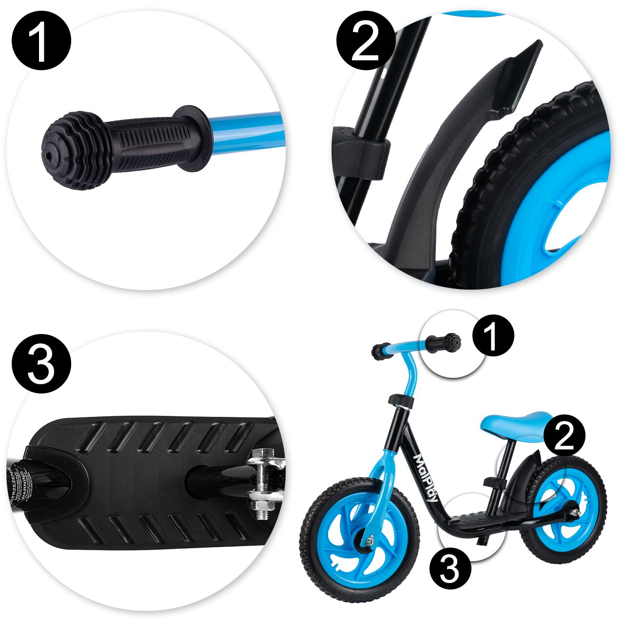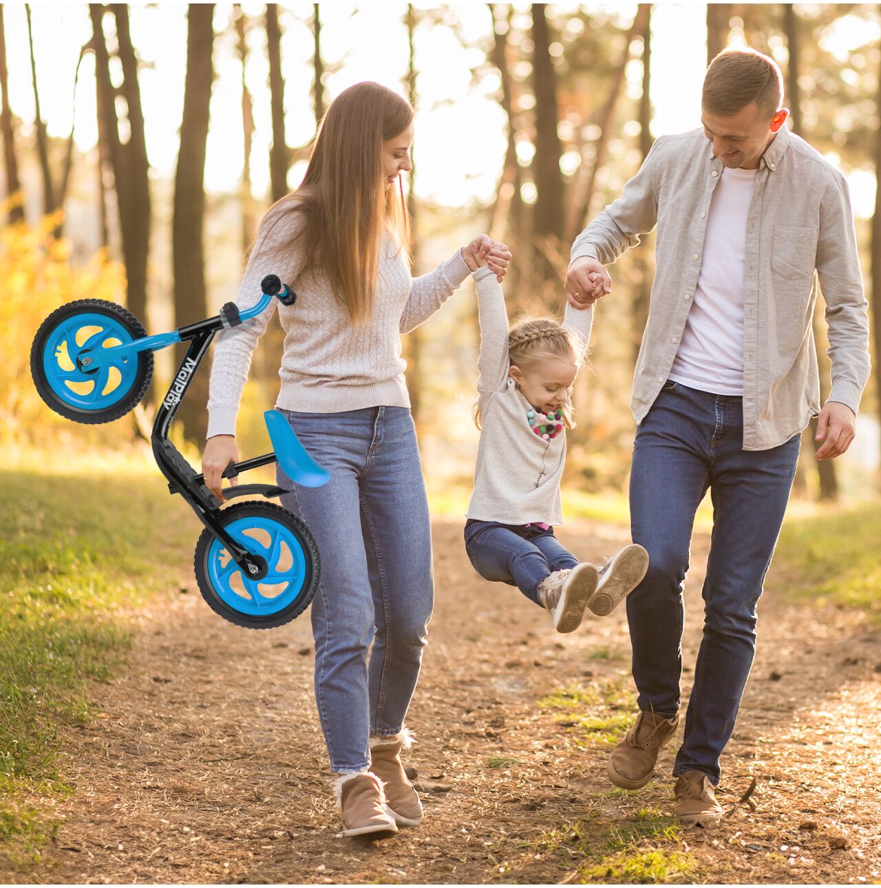 Utilizarea unei biciclete de echilibru permite copiilor sa dezvolte o varietate de abilitati, cum ar fi urcarea, demontarea, impingerea si franarea. Copiii invata sa-si controleze corpurile in spatiu si sa ia decizii cu privire la miscare.