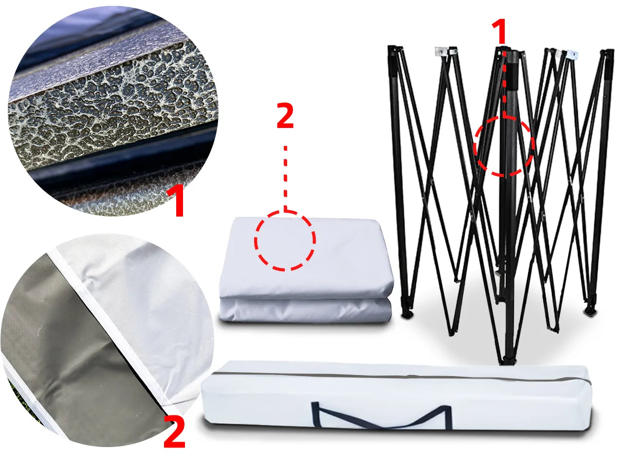 Sistemul de blocare faciliteaza asamblarea, dezasamblarea si reglarea pavilionului pliabil.