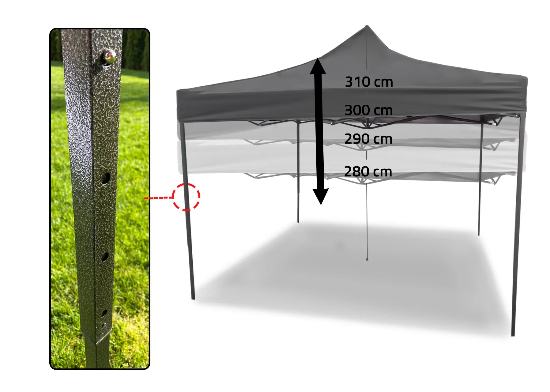 - Inaltimea pavilionului poate fi ajustata pe 4 niveluri (280, 290, 300 si 310 cm) , astfel incat il puteti adapta cu usurinta nevoilor dumneavoastra.