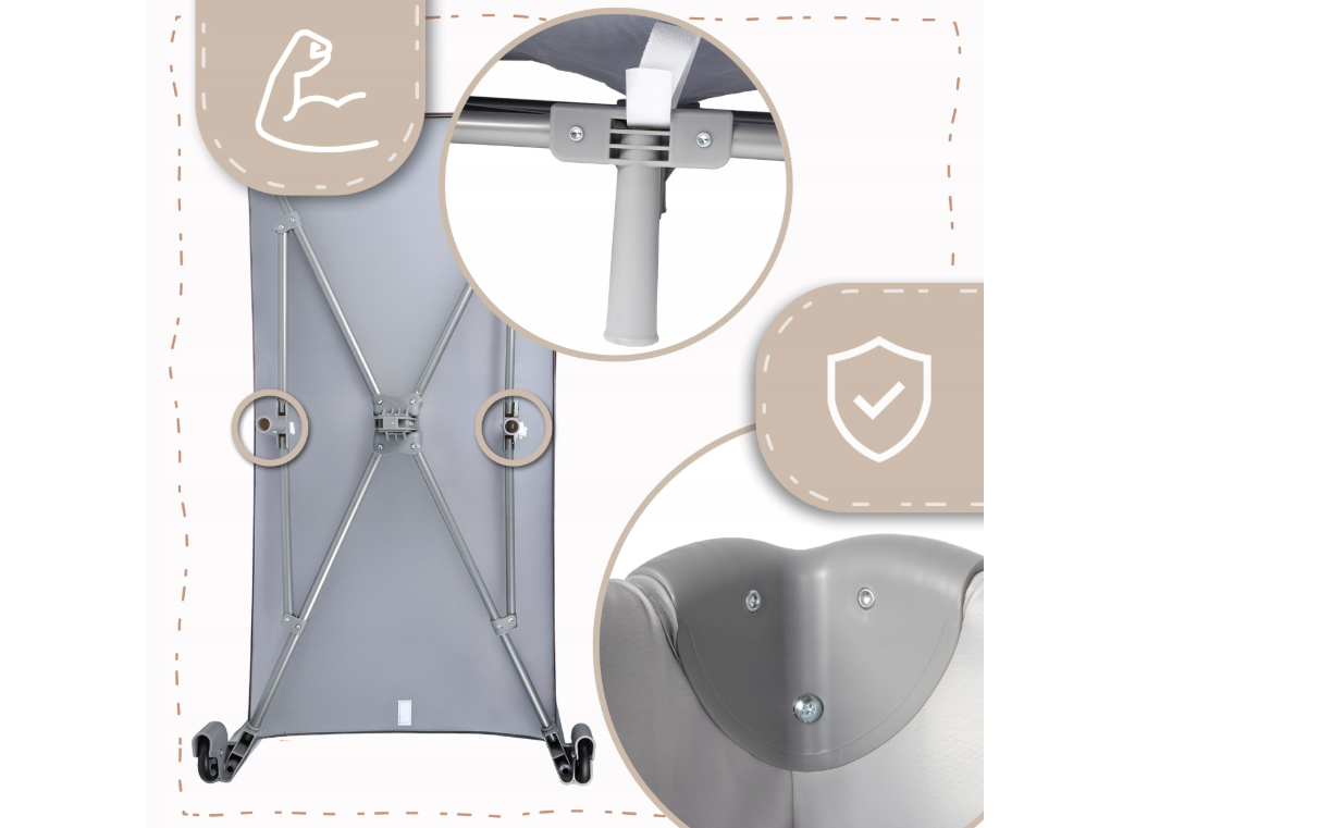 Sistemul de pliere si depliere al patutului LUNO ofera un confort imens pentru parinti. Nu sunt necesare unelte sau forta - doar cateva miscari simple si patutul este gata de utilizare. O incuietoare de siguranta asigura stabilitatea si siguranta structurii pe tot parcursul utilizarii.