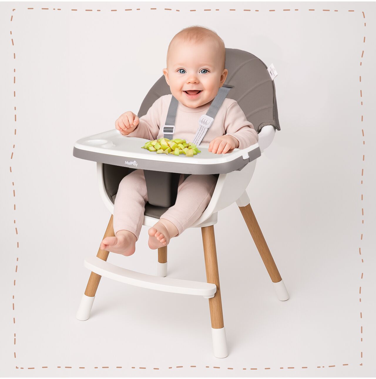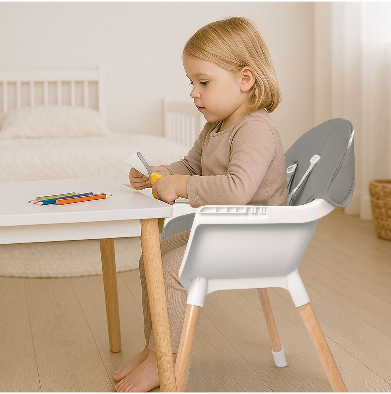 Datorita designului bine gandit si suportului pentru picioare, scaunul sustine pozitia corecta a corpului copilului - atat in timpul mesei, cat si in timpul jocului. Spatarul si sezutul stabile ofera confort si siguranta.
