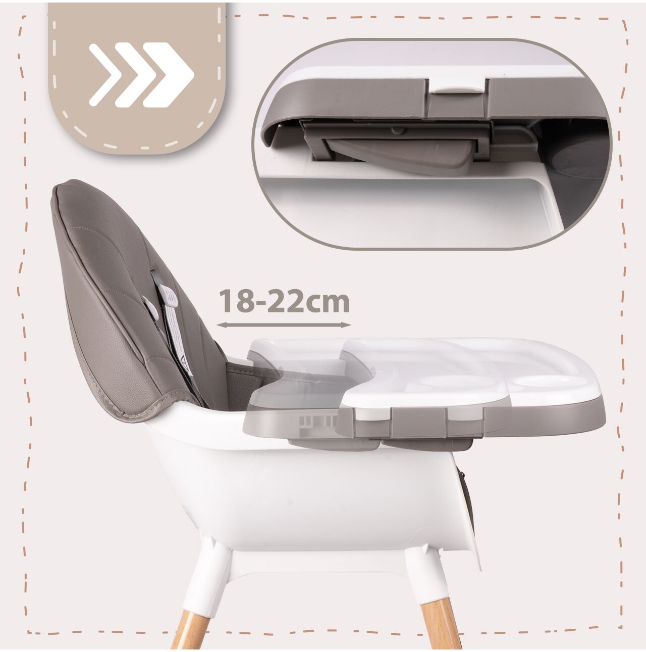 - Distanta reglabila dintre tava si spatar (distanta de la 18 cm la 22 cm) va permite sa adaptati perfect spatiul la nevoile unui copil in crestere. Datorita acestui fapt, copilul mic obtine un confort sporit in timpul primelor incercari de a manca independent, iar blatul mesei poate fi ajustat mai usor la varsta si postura copilului. In plus, capacul detasabil face curatarea dupa mese rapida si usoara.