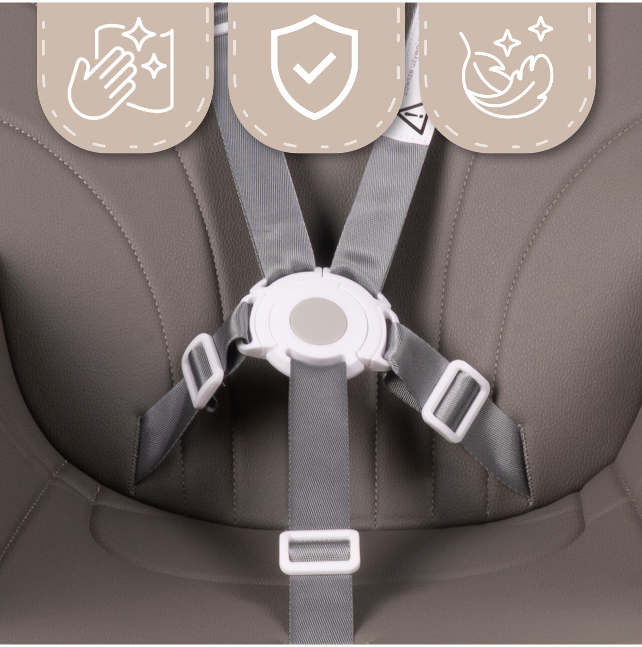 - Scaunul este echipat cu centuri de siguranta in 5 puncte, cu o pana intre picioare, pentru a preveni alunecarea accidentala a copilului.